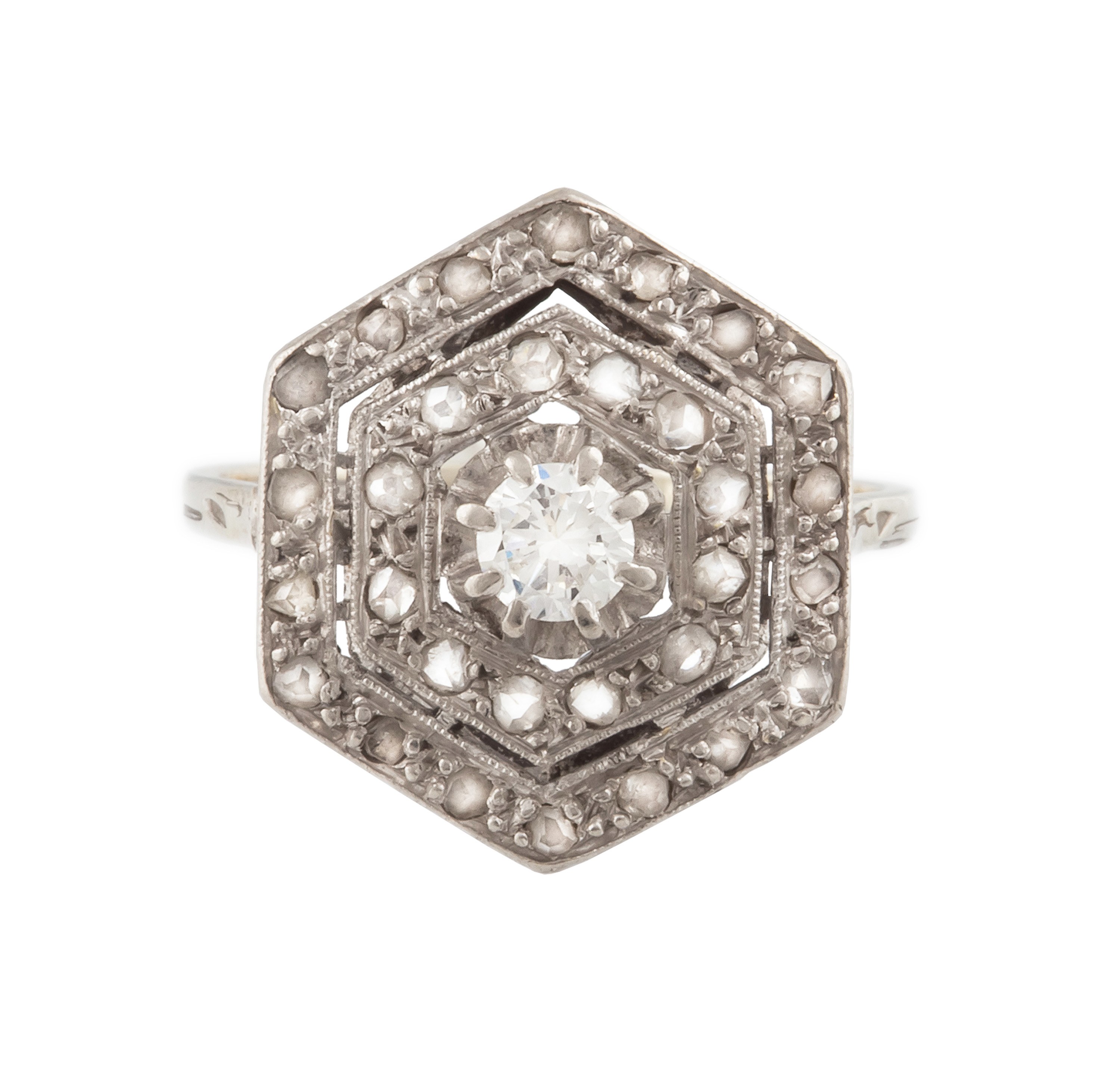 21 szt. diamentów w szlifie 8/8, łącznie ok. 0,16 ct, VS-SI/H-I, 6 szt. rozet diamentowych; rozmiar 13