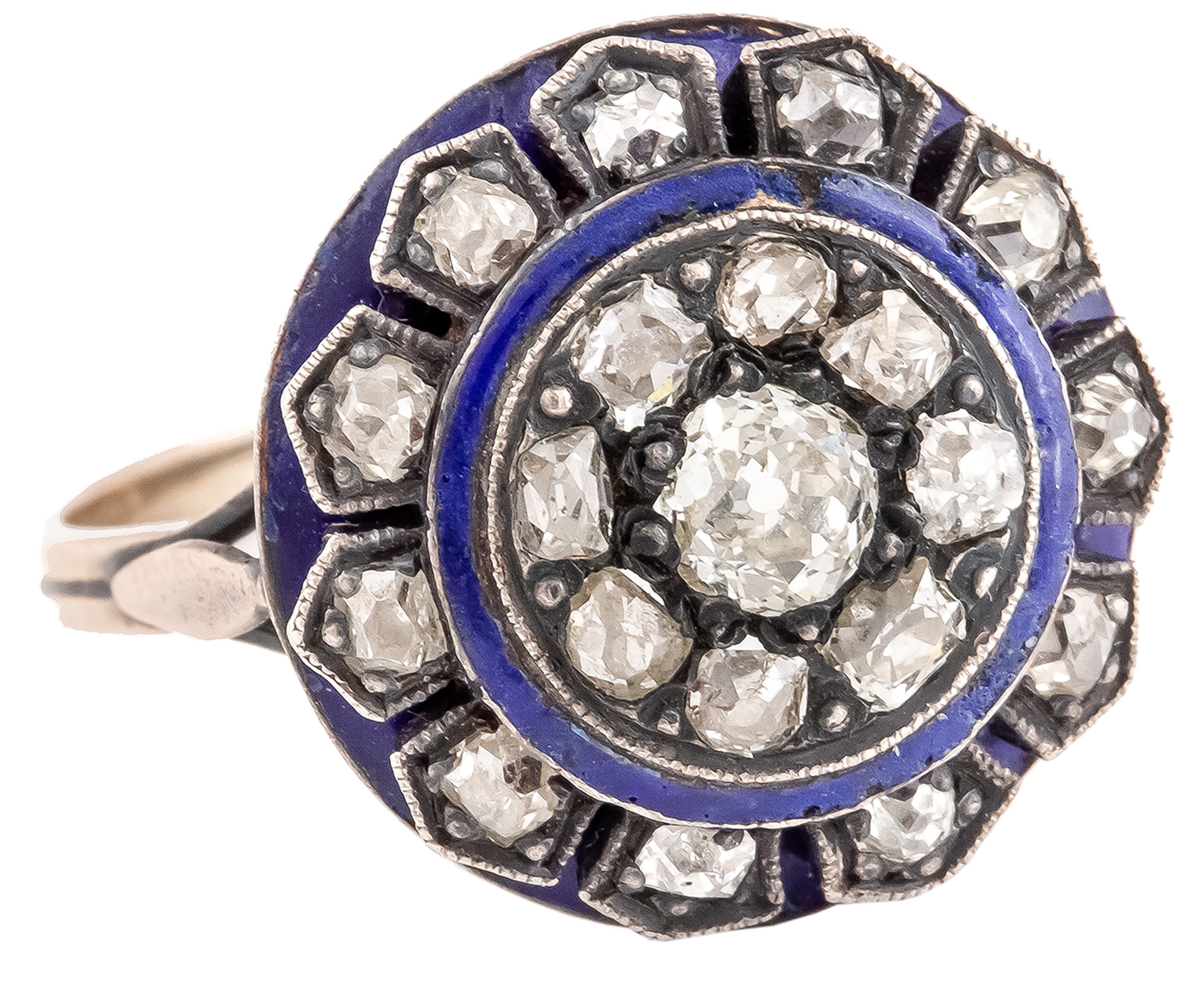 brylant centr. w starym szlifie, ok. 0,40 ct, 19 szt. diamentów w starym szlifie 8/8, łącznie ok. 0,80 ct, emalia