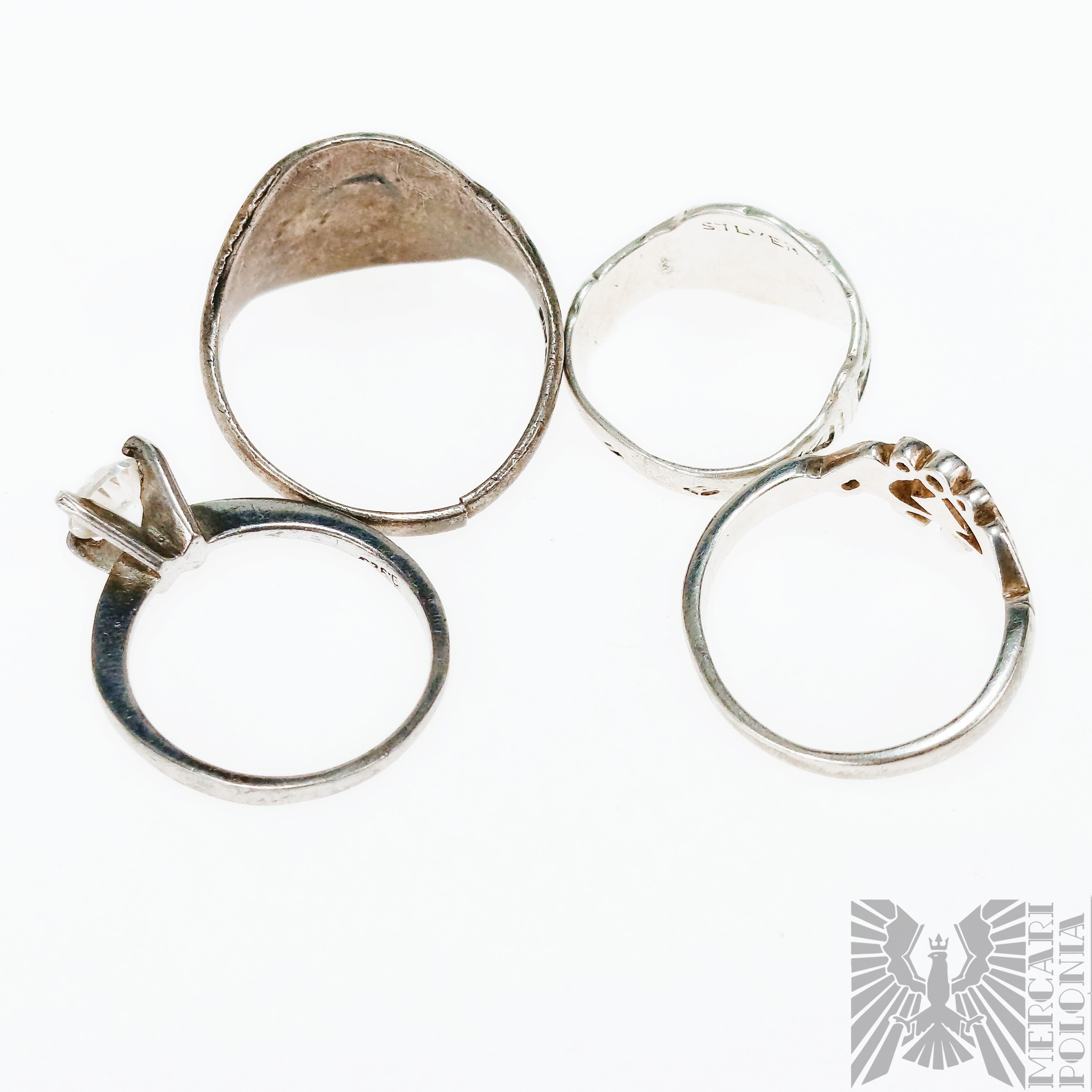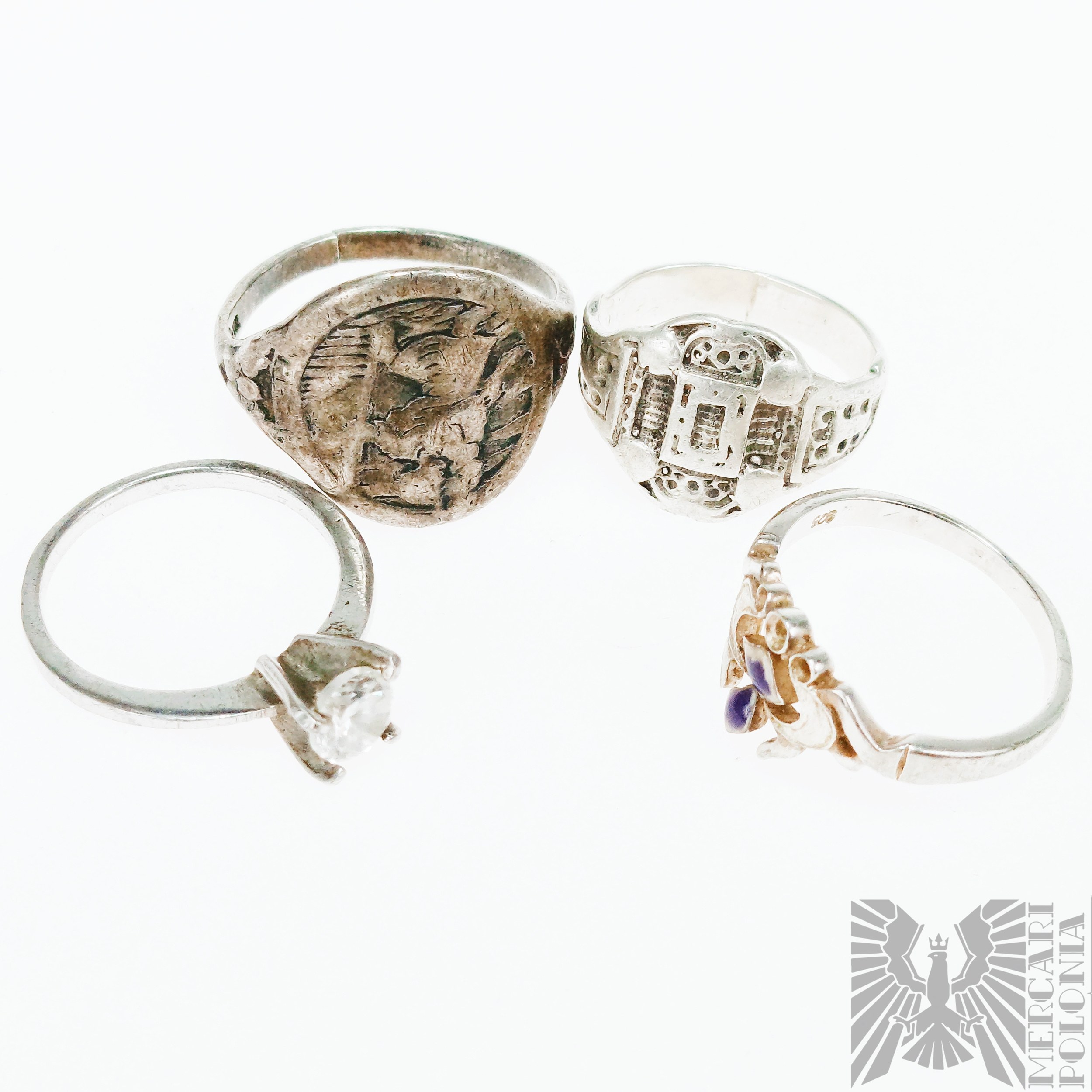 Zestaw Czterech Pierścionków Vintage, Srebro 925, masa zestawu 15.35 gram, zestaw się składa z Pierścionka z obrazem św. Krzysztofa (Rozmiar 24), Pierścionka z fioletową Emalią (Rozmiar 16), Pierścionka Vintage (Rozmiar 11) oraz Pierścionka z Białą Cyrkonią (Rozmiar 16)