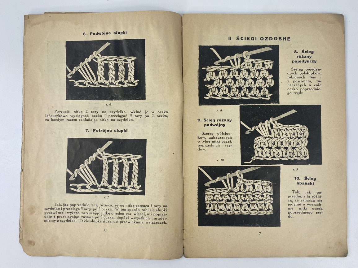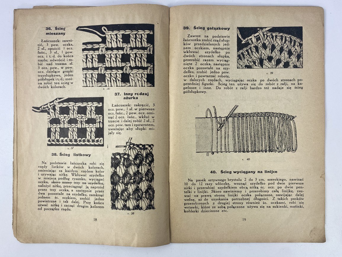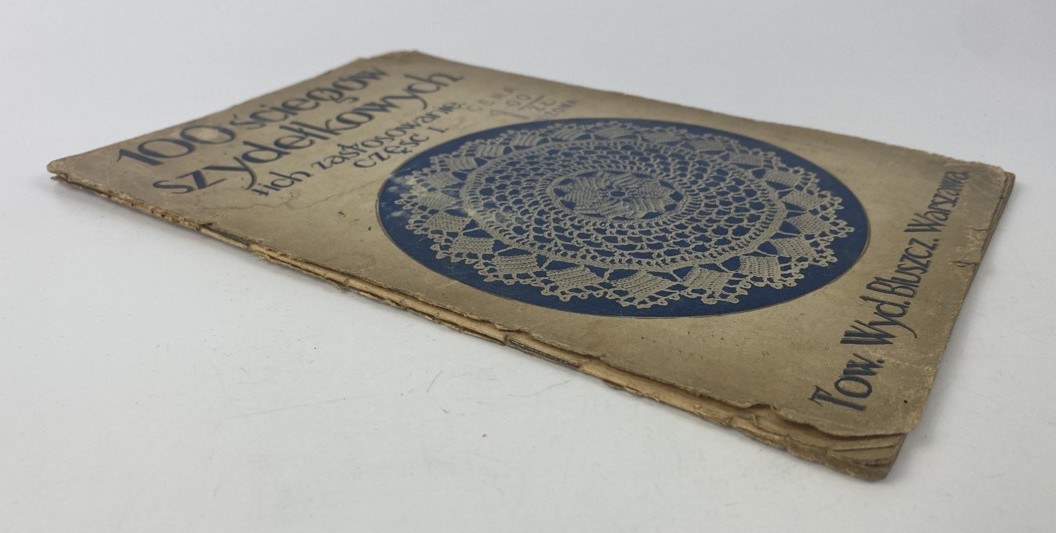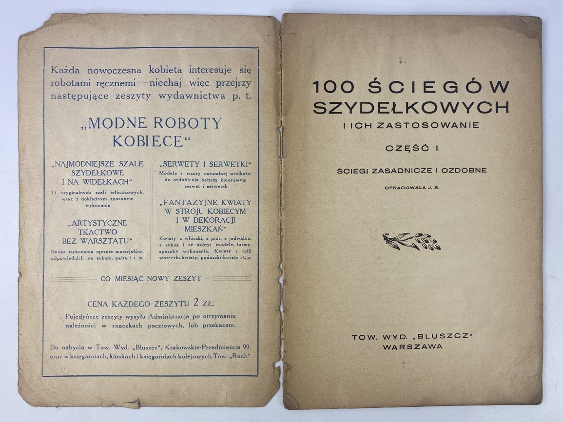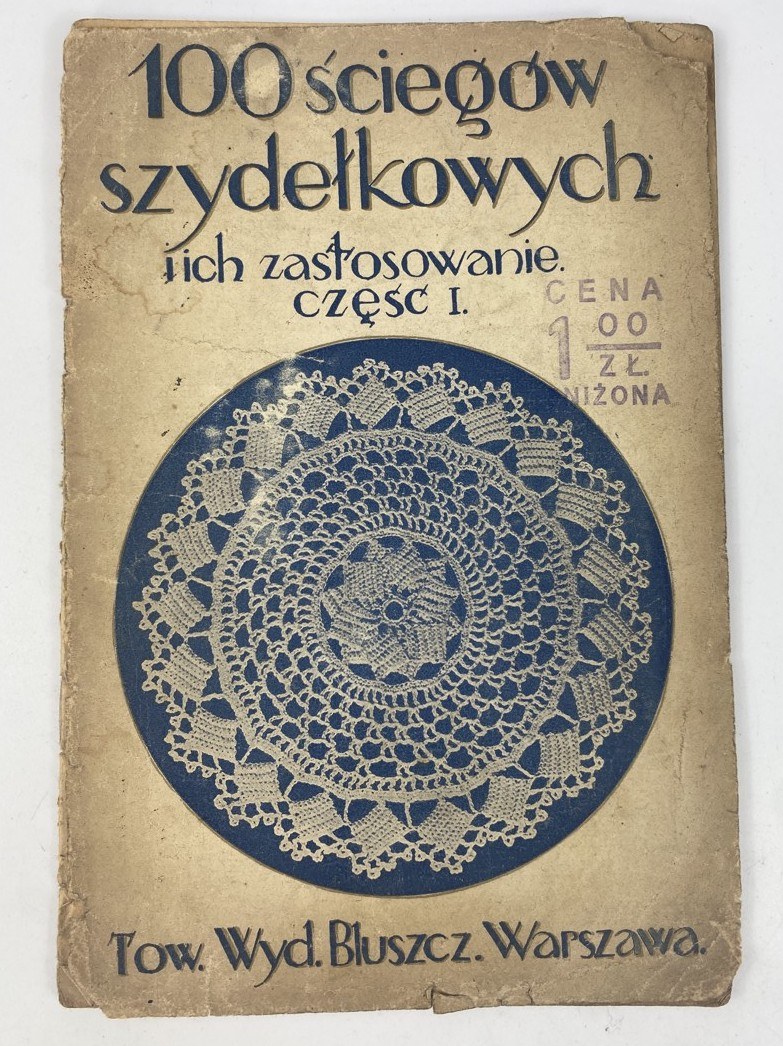 100 ściegów szydełkowych i ich zastosowanie. Cz. 1, Ściegi zasadnicze i ozdobne / oprac. J. S, Towarzystwo Wydawnicze "Bluszcz", Warszawa [1928], s. 31, [1], wymiary 15,5 x 23,5 cm. Ślady zalania. Okładka broszurowa, wydawnicza. Zabrudzenia, naddarcia okładki.