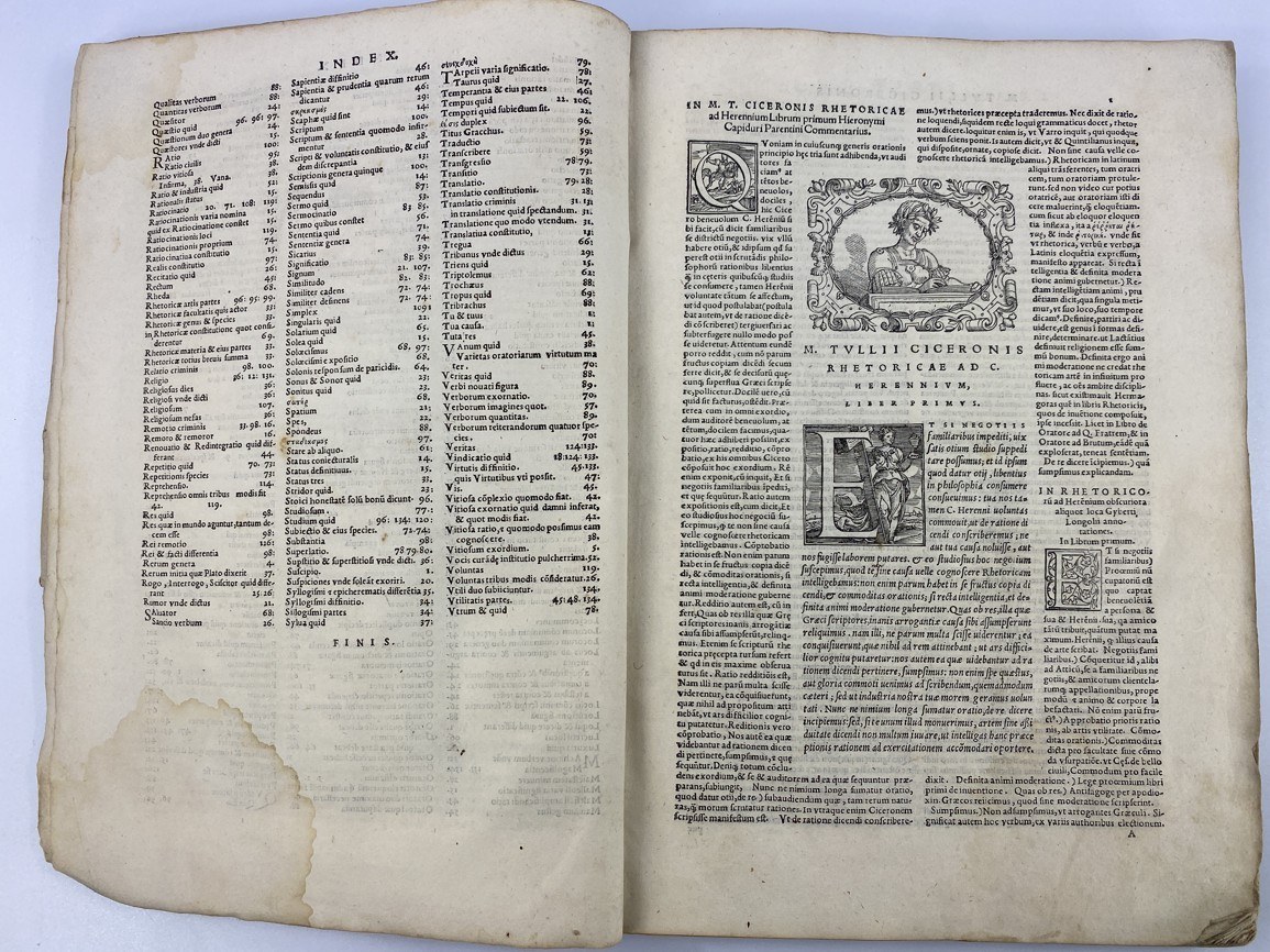 [Cyceron] M. Tullii Ciceronis Rhetoricorum ad Herennium libri quatuor… [Retoryka dla Herenniusza ksiąg czworo], Wenecja 1550 [!], s. 140, wymiary 22 x 31,5 cm, okładka pergaminowa z epoki [niewielkie ubytki], wykaligrafowana nazwa na grzebiecie, część kart z niewielkimi śladami zalania, brak śladu owadów etc., wykaligrafowane marginalia, notatki piórem na ostatniej stronie, postrzępione brzegi kart, tekst kompletny.