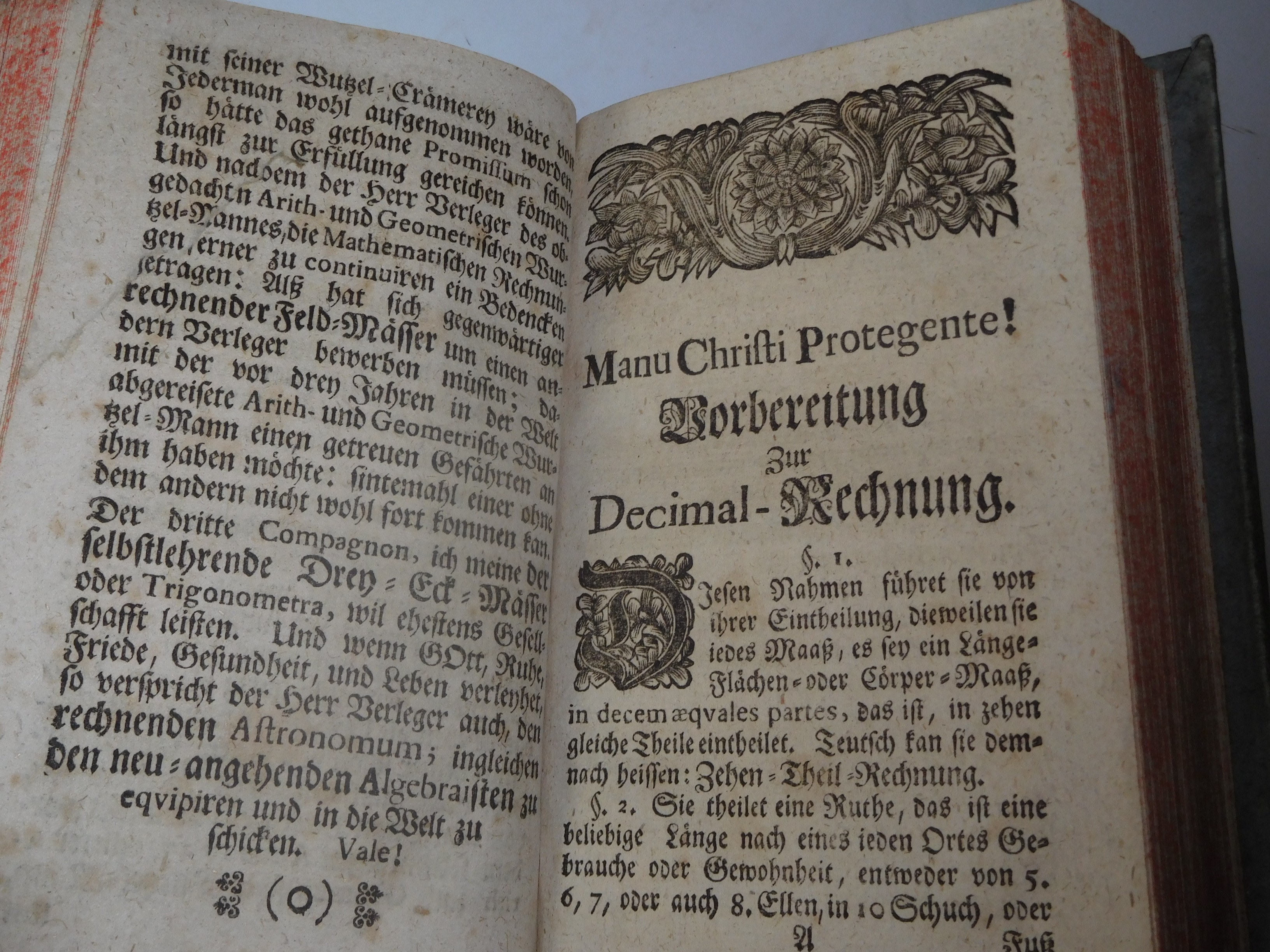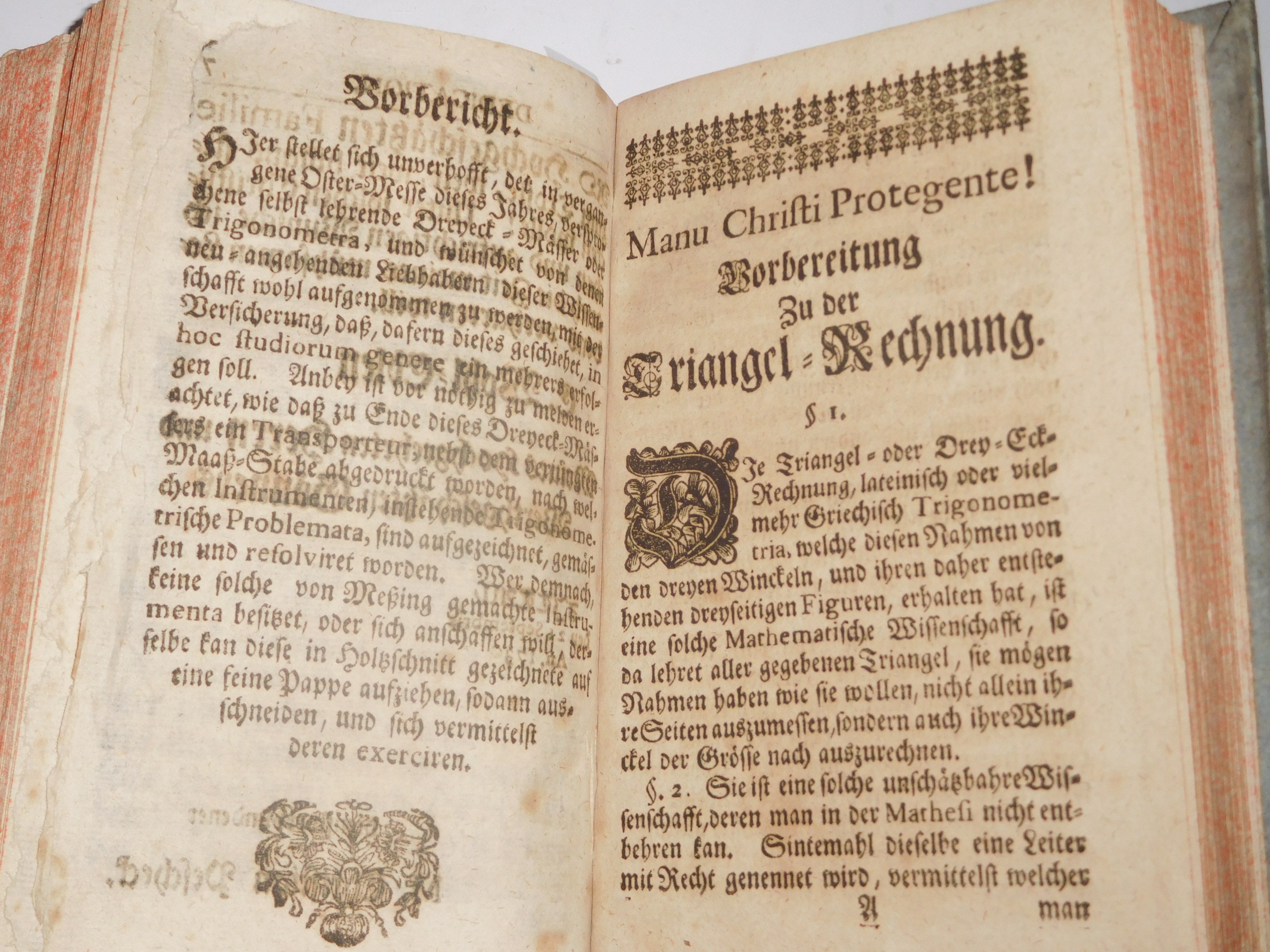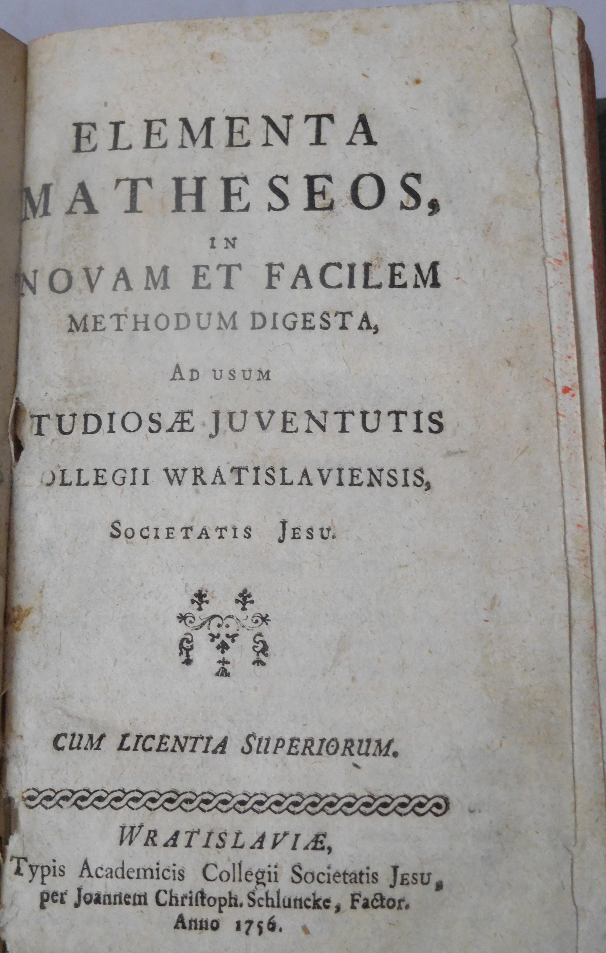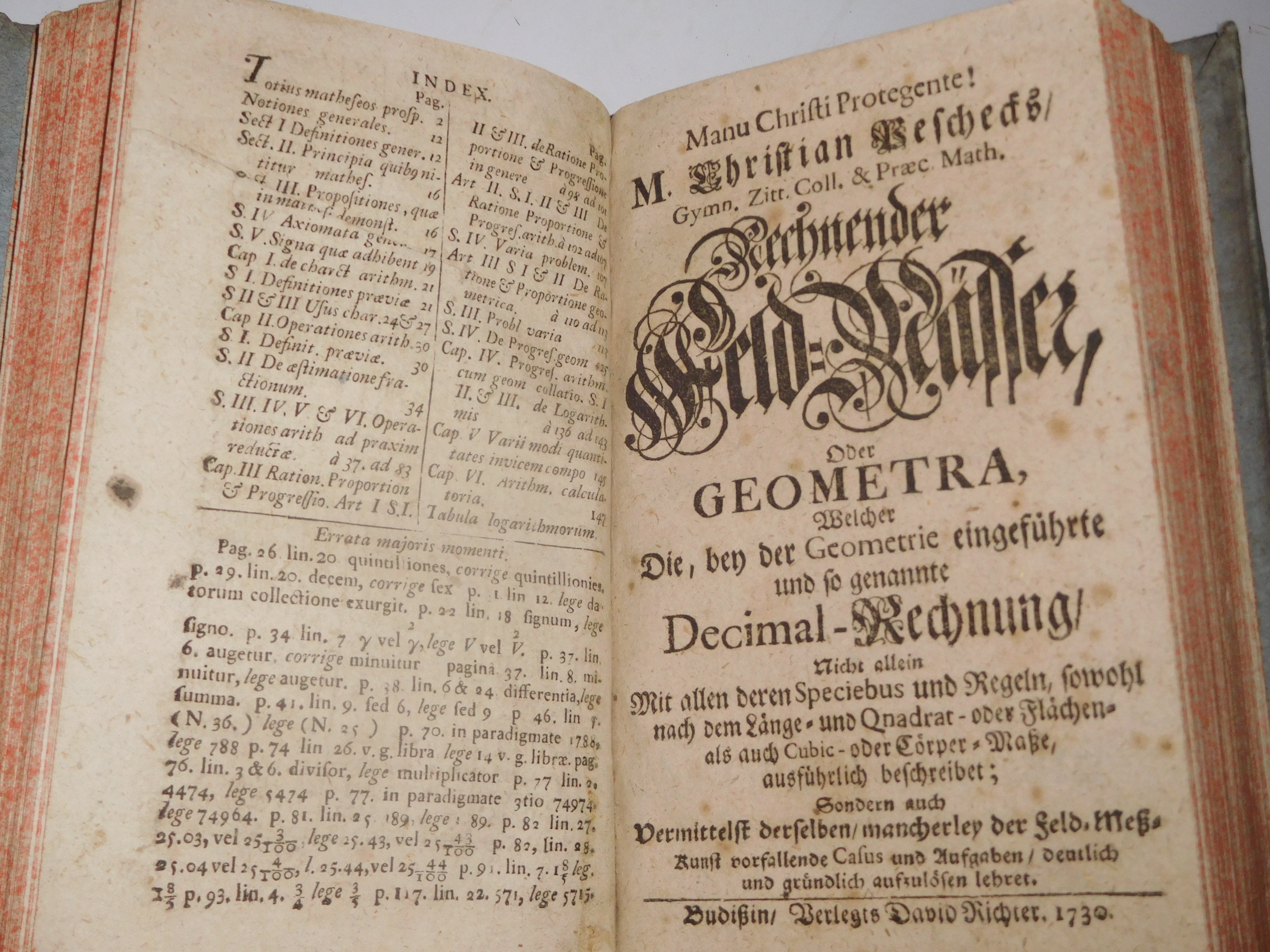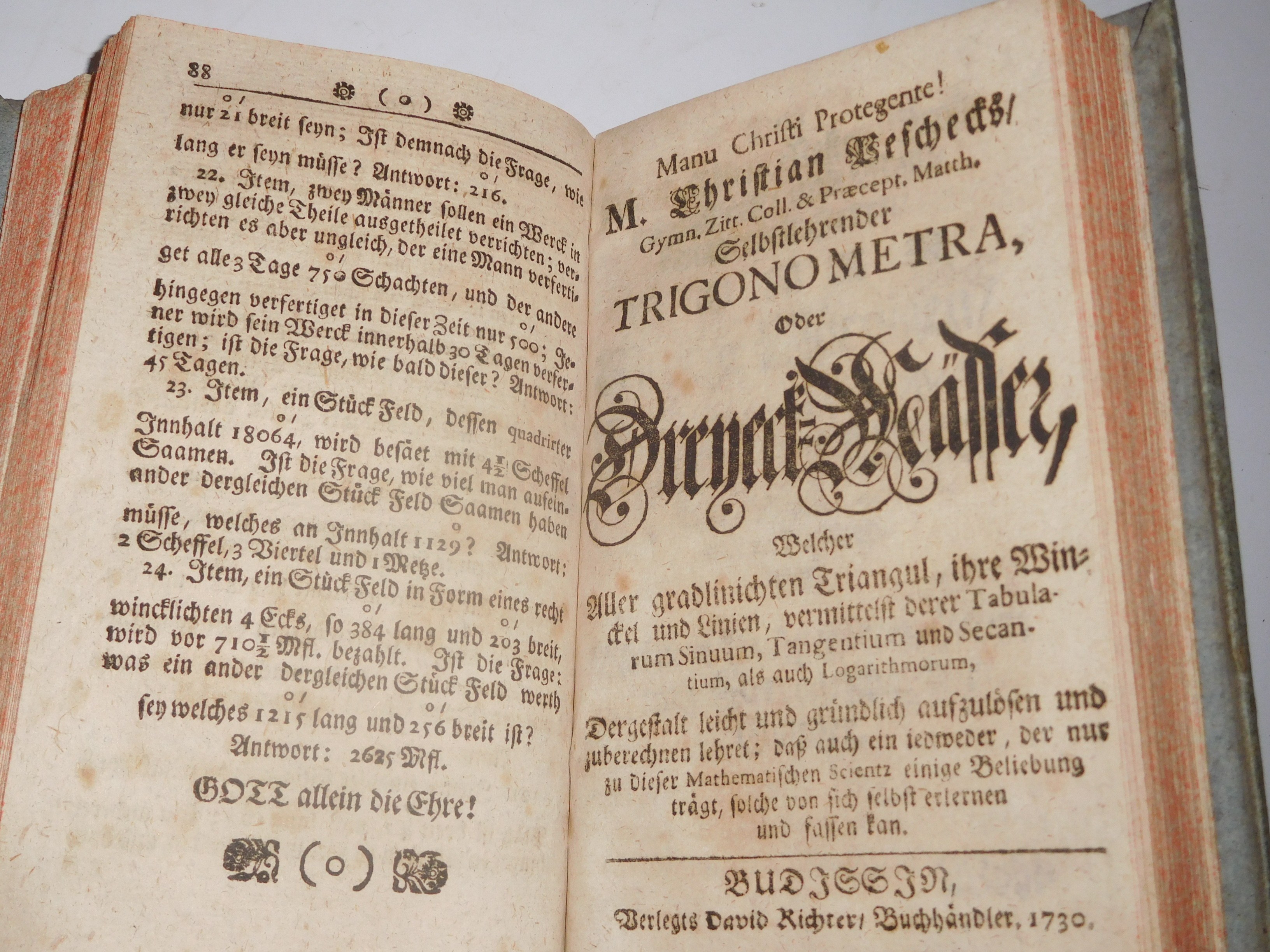 33. PESCHECK CHRISTIAN, Rechnender Feld-Mässer, Oder Geometra: Welcher Die, bey der Geometrie eingeführte und so genannte Decimal-Rechnung. (…). PESCHECK CHRISTIAN Selbstlehrender Trigonometra, Oder Dreyeck-Mässer (…). Elementa Matheseos in novam et facilem methodum digesta, ad usum studiosae juventutis collegii Wratislaviensis, societatis Jesu (…).