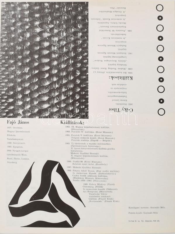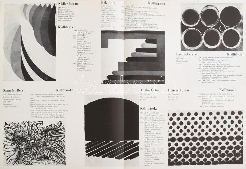 1970 Attalai Gábor, Bak Imre, Csiky Tibor, Fajó János, Hencze Tamás, Lantos Ferenc, Nádler István, Szatmári Béla. 1970-ben, a salgótarjáni József Attila Művelődési Házban rendezett Új geometrikus és strukturális törekvések c. kiállítás kihajtható, kétoldalas katalógusa. Tervezte: Szatmári Béla. A művészek 1-1 db alkotásának fekete-fehér reprodukciójával. Megjelent 500 példányban. Haulisch Lenke bevezetőjével. Jó állapotban. 36x55 cm Rendkívül ritka!
