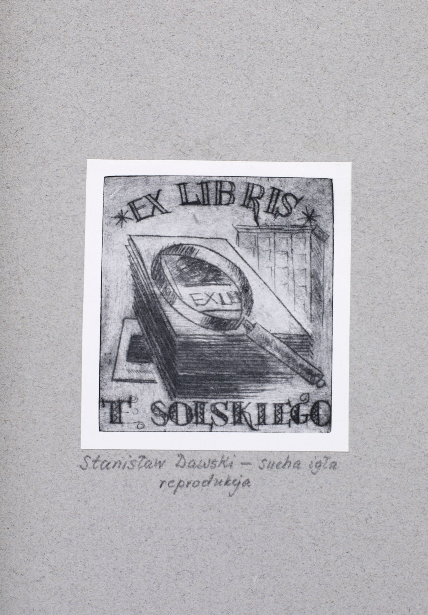 Dołączono luzem odbitki 5 ekslibrisów dla T. Solskiego (Młodzianowski z 1951 r., Agopsowicz, Bruchnalskiego z 1936 r. - dwie odbitki w różnych kolorach oraz Tomeckiego z 1958 r.).