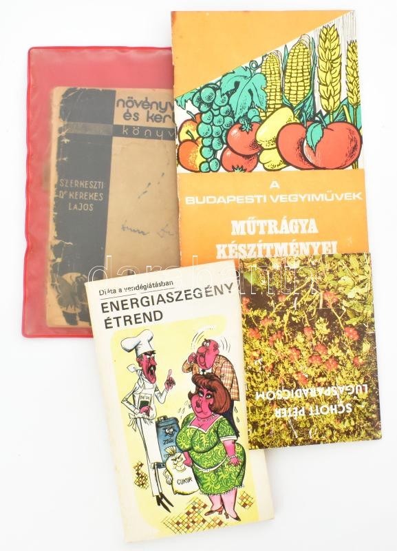 4 db étrend és növénytermesztés könyv és nyomtatvány: Horn János: Őszibarack termesztése. Növényvédelem és Kertészet Könyvtára. Bp., 1937, Növényvédelem és Kertészet, 77+3 p. Kiadói papírkötés, sérült, foltos és elvált borítóval, laza fűzéssel, címlap kissé sérült, megviselt állapotban. + Gaál Endréné, Horváth László, Lontai Egonné: Diéta a vendéglátásban. Energiaszegény étrend. H.n., 1984, k.n. Kiadói papírkötés. + Schott Péter: Lugasparadicsom. H.n., é.n., szerzői. Kiadói papírkötés. + A Budapesti Vegyiművek műtrágya készítményei. Bp., 1984, Budapesti Vegyiművek. Kézirat. Kiadói papírkötés, kissé foltos borítóval.