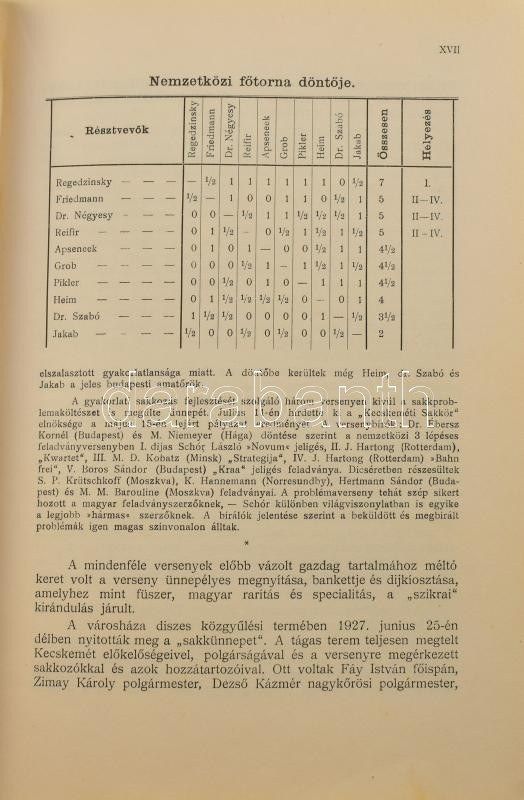 A kecskeméti nemzetközi sakkverseny 1927. A mesterverseny összes, a főtorna és a középiskolai bajnokság válogatott játszmái. A nemzetközi feladványverseny bírói jelentése. Sakktörténeti és elméleti cikkek, jellemrajzok, feladványok és végjátékok. Szerk.: Tóth László. Kecskemét, 1928, Magyar Sakkvilág, XXIV+308+2 p.+4 t. Átkötött egészvászon-kötés, kopott, kissé foltos borítóval.
