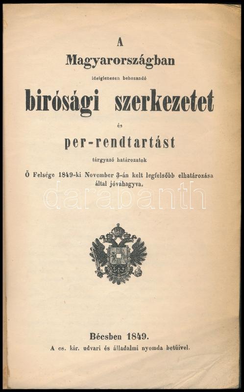A Magyarországban ideiglenesen behozandó bírósági szerkezet és per-rendtartást tárgyazó határozatok. Ő Felsége által 1849-ki november 3-án. Bécsben, 1849, A cs. kir. udvari és álladalmi nyomda betűivel, 14 p. Papírkötés, modern műanyag védőborítóban, a lapok sarkain gyűrődésekkel, foltos. Ritka!
