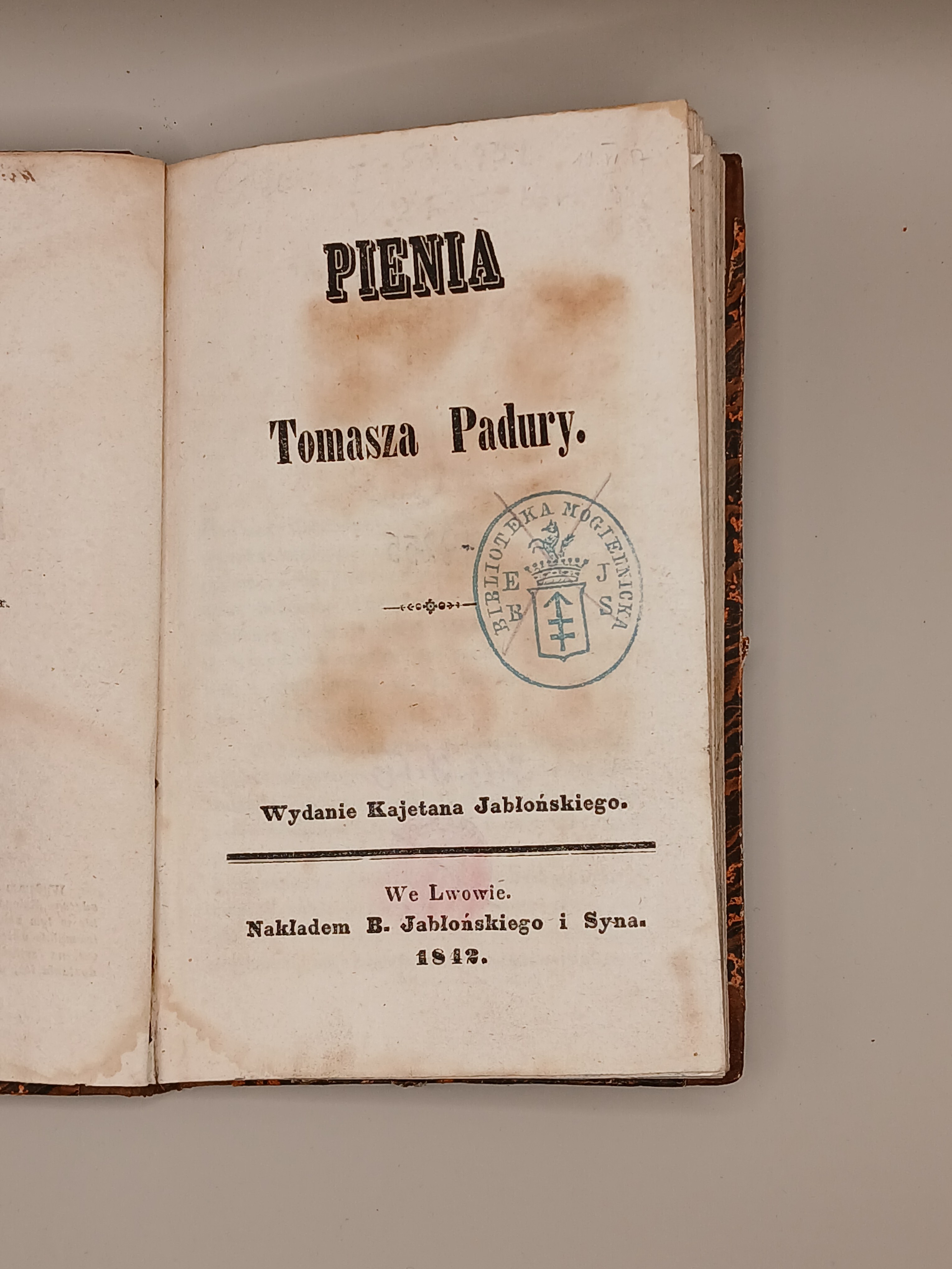 Tomasz Padura. Pienia. Lwów 1842. Wydanie Kajetana Jabłońskiego, nakładem B. Jabłońskiego i Syna, s. VIII, 100, 17,5 x 11 cm, oprawa psk. z epoki z ubytkiem na grzbiecie. Zbiór utworów polsko-ukraińskiego poety i kompozytora, przyjaciela podróżnika i pamiętnikarza Wacława Rzewuskiego (1784–1831). Podczas podróży nad Dniepr, na tereny Siczy zbierał podania o dziejach Kozaczyzny, interesował się jej folklorem. Autor poematu Kudak, tłumaczył na ukraiński Konrada Wallenroda Adama Mickiewicza oraz utwory George’a Byrona, tworzył pieśni i dumki, przypisuje mu się autorstwo pieśni Hej, Sokoły.