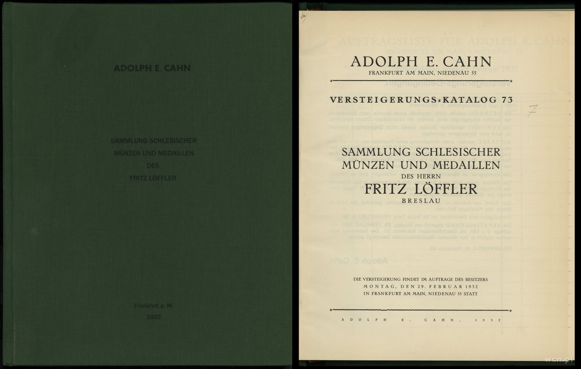 Katalogi aukcyjne, Adolph E. Cahn, Versteigerungs-Katalog 73. Sammlung schlesischer Münzen und Medaillen des Herrn Fritz Löffer, Breslau; Frankfurt am Main, 29.02.1932; 103 strony + 12 tablic opisujących 2.333 pozycji, twarda oprawa introligatorska, dodatkowo część listy szacunkowej (pozycje 1–741 oraz 1.617–2.333); notowania: E. E. Clain-Stefanelli poz. 9588, J. Dutkowski „Złoto czasów dynastii Wazów” tom III str. 646; katalog aukcji jednego z większych przedwojennych zbiorów monet śląskich należącego do Fritza Löfflera; przy wszystkich pozycjach dopisane ceny osiągnięte (?), tablice przycięte do formatu katalogu, bez większej szkody dla ilustracji, pięknie zachowany katalog, rzadki w handlu.