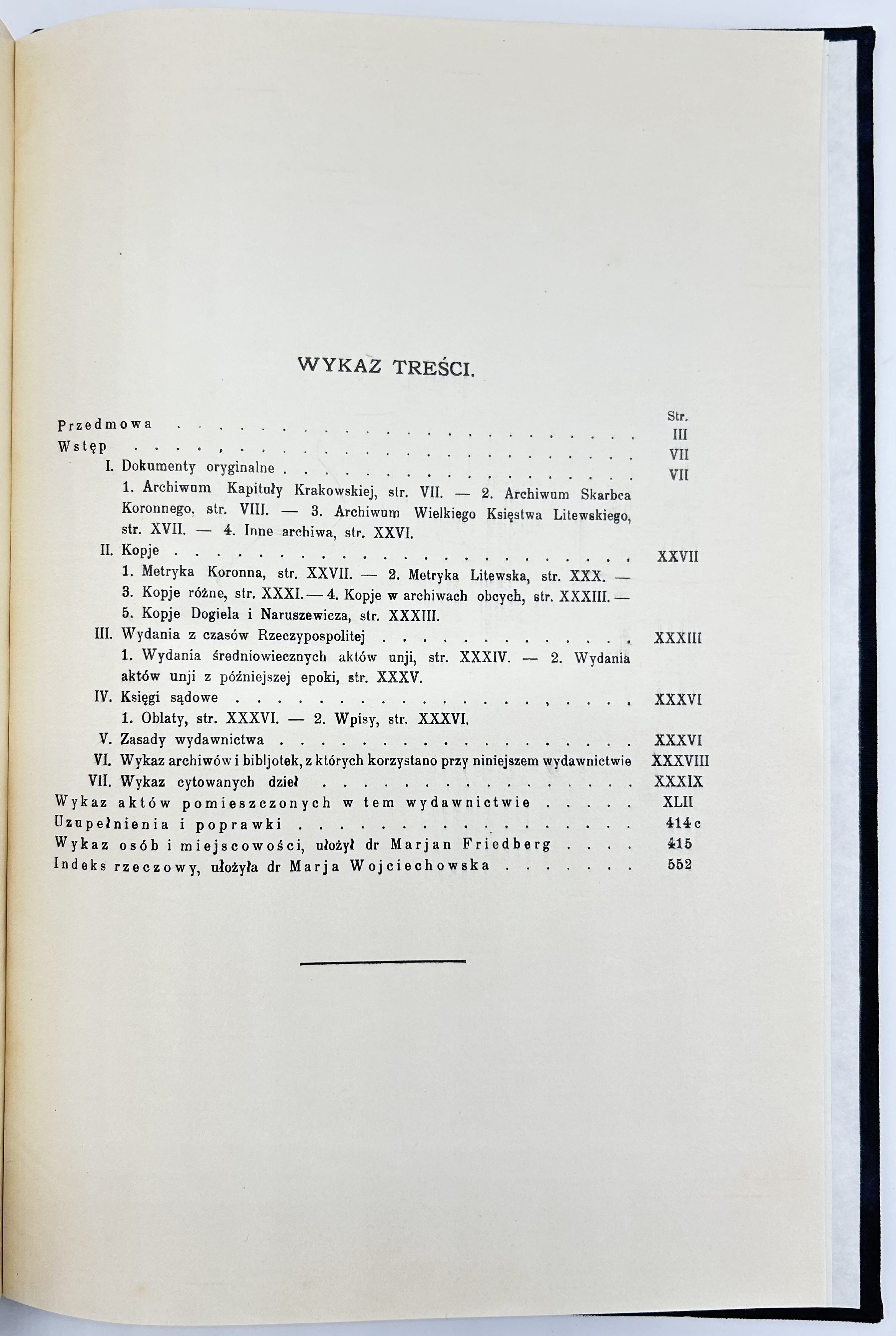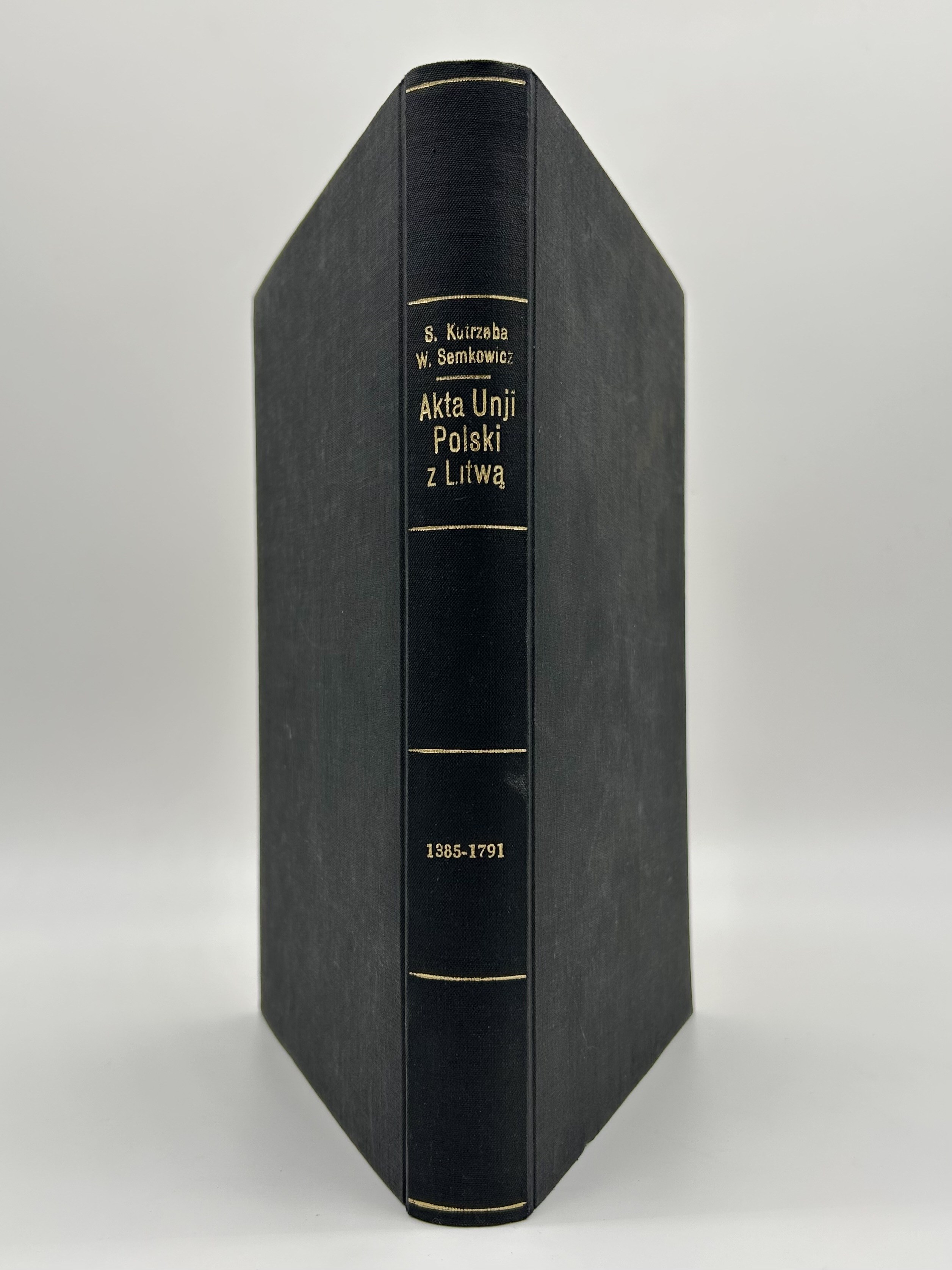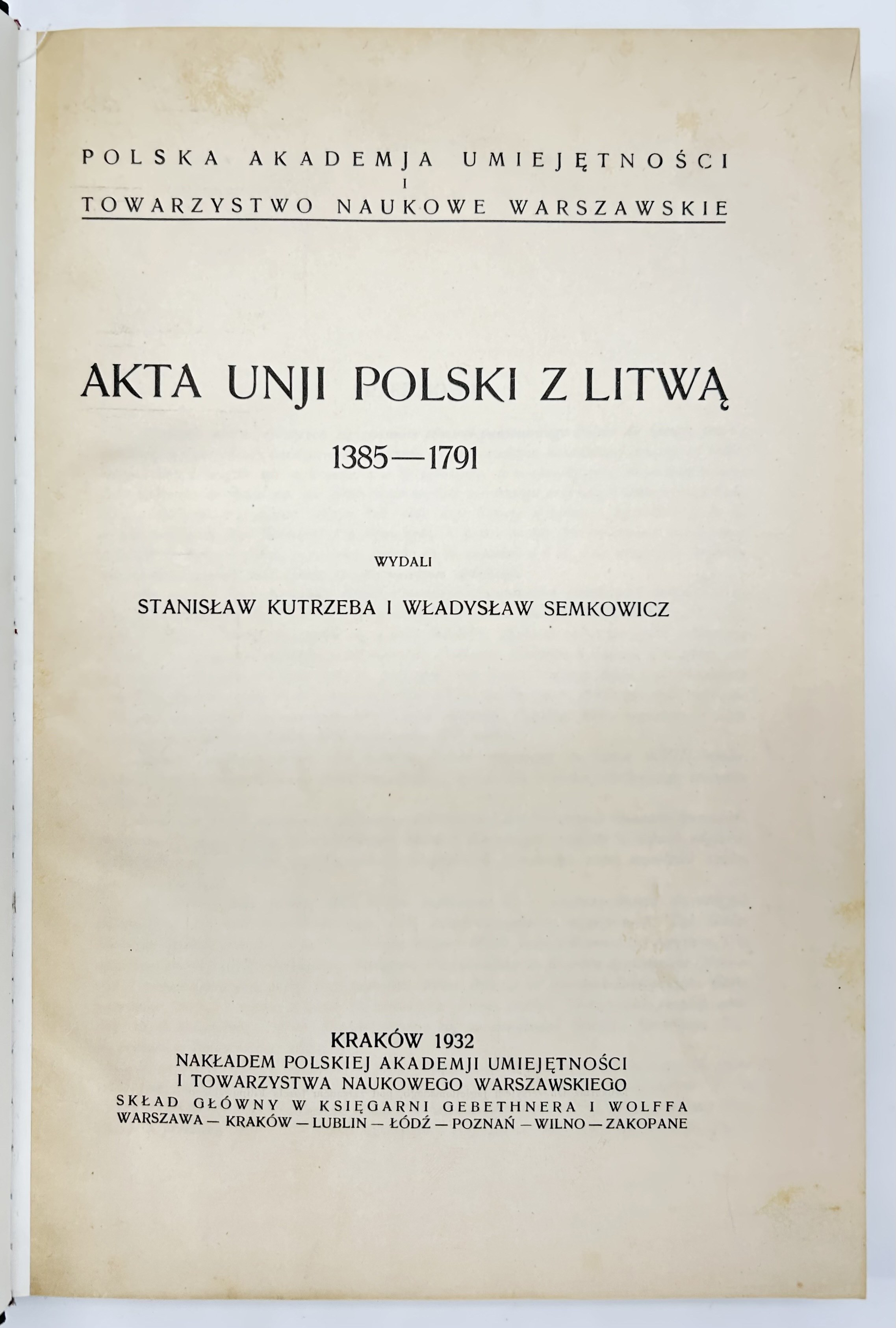 Akta unji Polski z Litwą 1385-1791 wydali Stanisław Kutrzeba i Władysław Semkowicz/ Kraków 1932/ Polska Akad. Umiejętności : Tow. Naukowe Warszawskie/ płócienna oprawa introligatorska, złocona tytulatura na grzbiecie/ s.LVI,570[1]/ tekst w języku polskim oraz łacińskim/ stan bardzo dobry