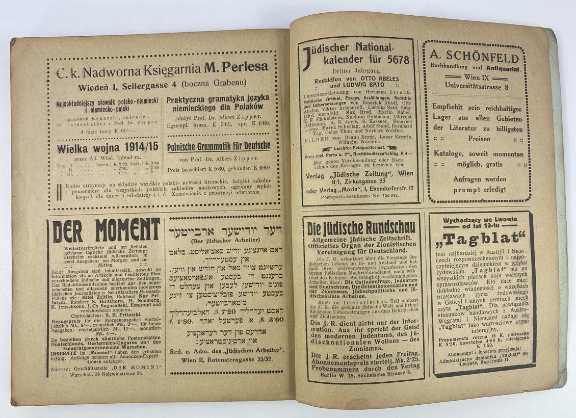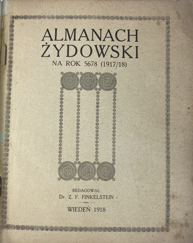 Almanach Żydowski: na rok ..., 5678 (1917/18), red. Z.F. Finkelstein, Wiedeń 1918, s. 265, [7], wymiary 16 x 19,5 cm. Okładka broszurowa, wydawnicza. Zabrudzenia, otarcia okładki.