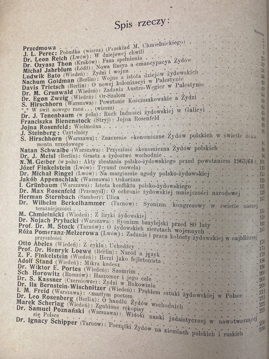 W treści m.in.: Ruch ludności żydowskiej w Galicji, Przyszłość ekonomiczna Żydów polskich, Istota konfliktu polsko-żydowskiego, Zadanie i praca kobiety żydowskiej w najbliższej przyszłości.