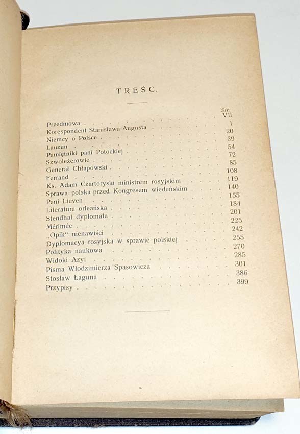 T. 1 zawiera m.in. rozprawy: Korespondent Stanisława Augusta; Pamiętniki pani Potockiej; Szwoleżerowie; Generał Dezydery Chłapowski; Ks. Adam Czartoryski ministrem rosyjskim; Sprawa polska przed Kongresem Wiedeńskim; Dyplomacja rosyjska w sprawie polskiej; Pisma Włodzimierza Spasowicza; Stosław Łaguna.