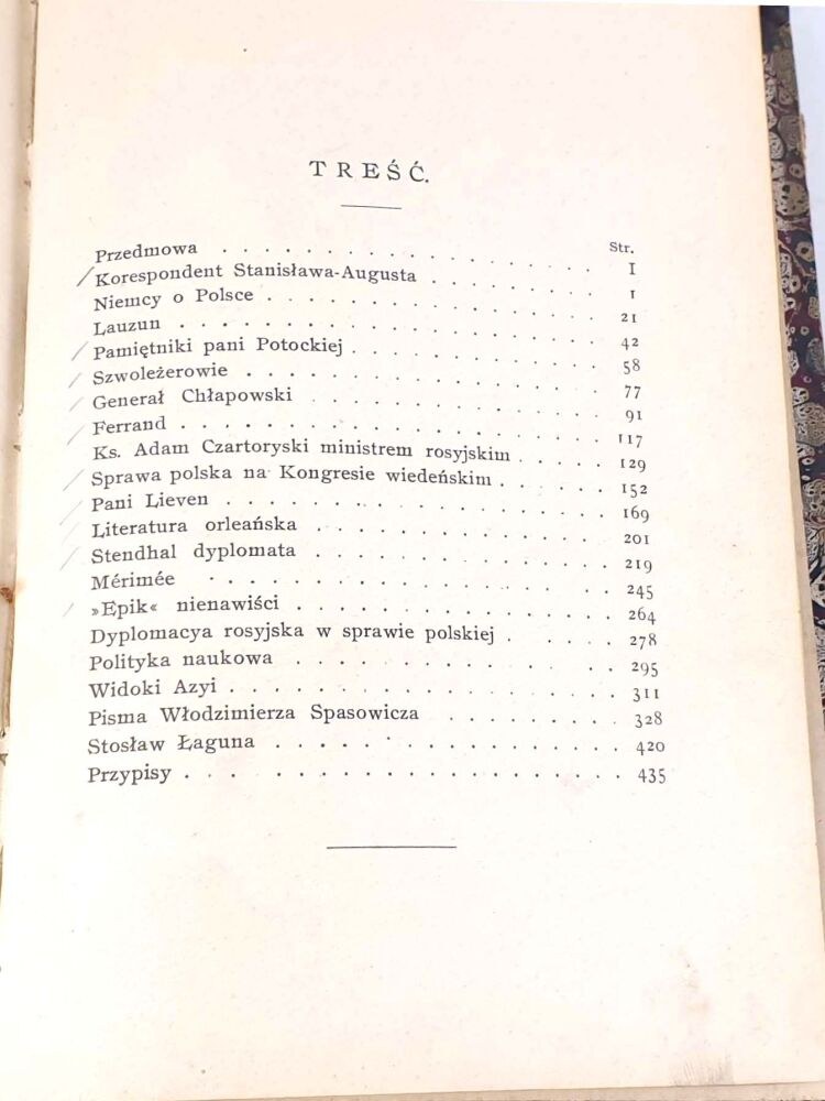 T. 1 zawiera m.in. rozprawy: Korespondent Stanisława Augusta; Pamiętniki pani Potockiej; Szwoleżerowie; Generał Dezydery Chłapowski; Ks. Adam Czartoryski ministrem rosyjskim; Sprawa polska przed Kongresem Wiedeńskim; Dyplomacja rosyjska w sprawie polskiej; Pisma Włodzimierza Spasowicza; Stosław Łaguna.
