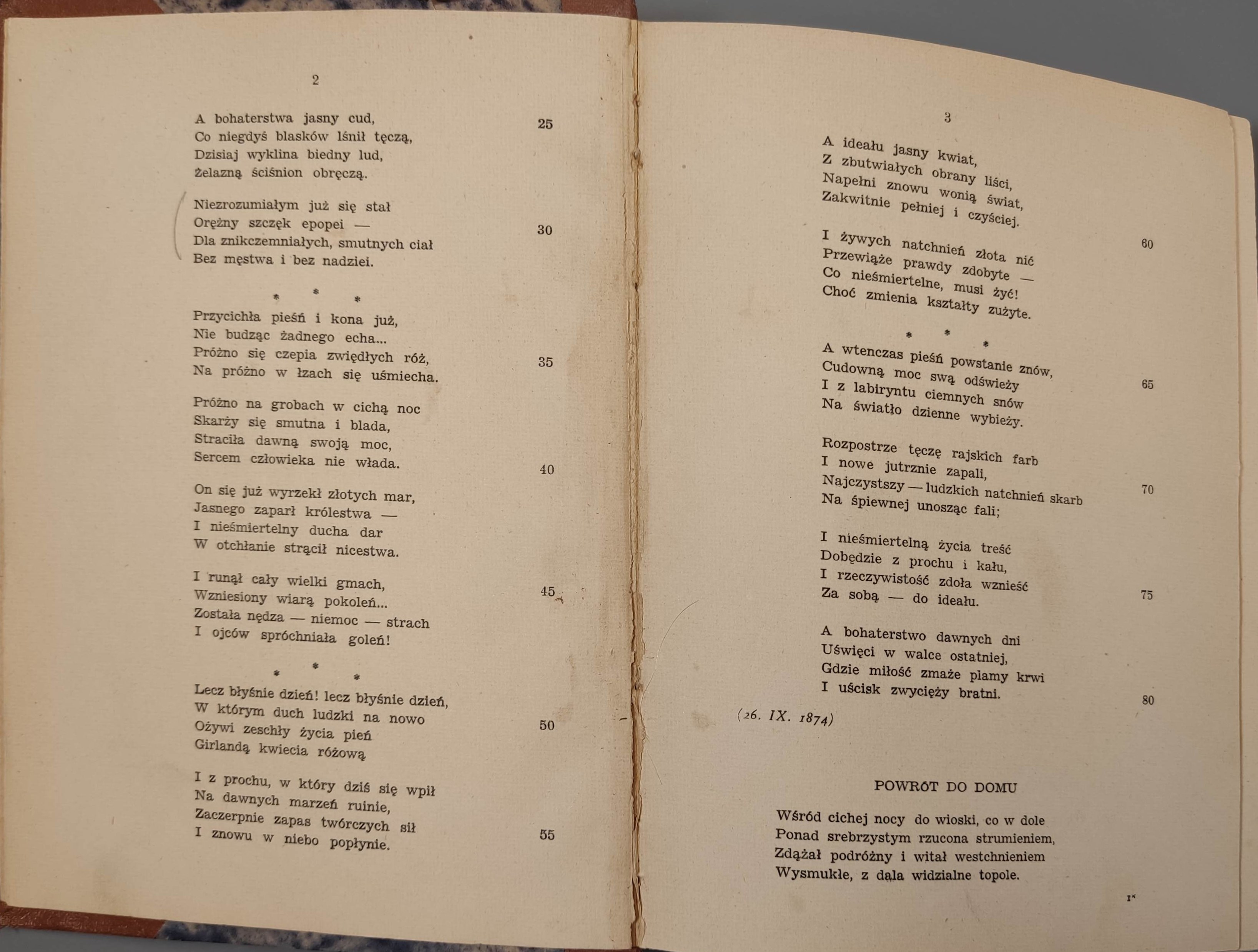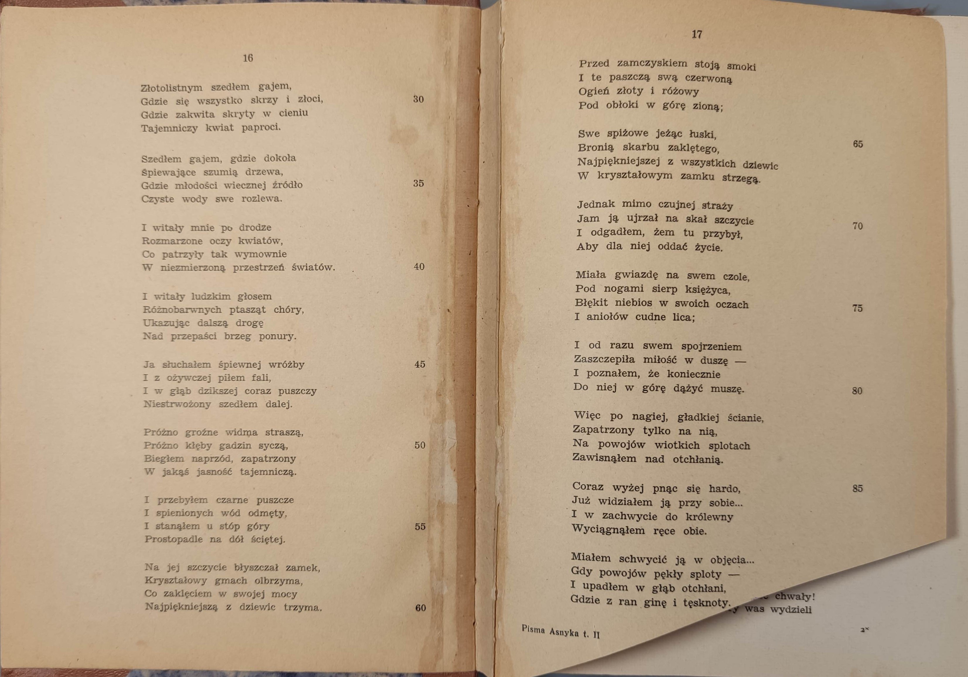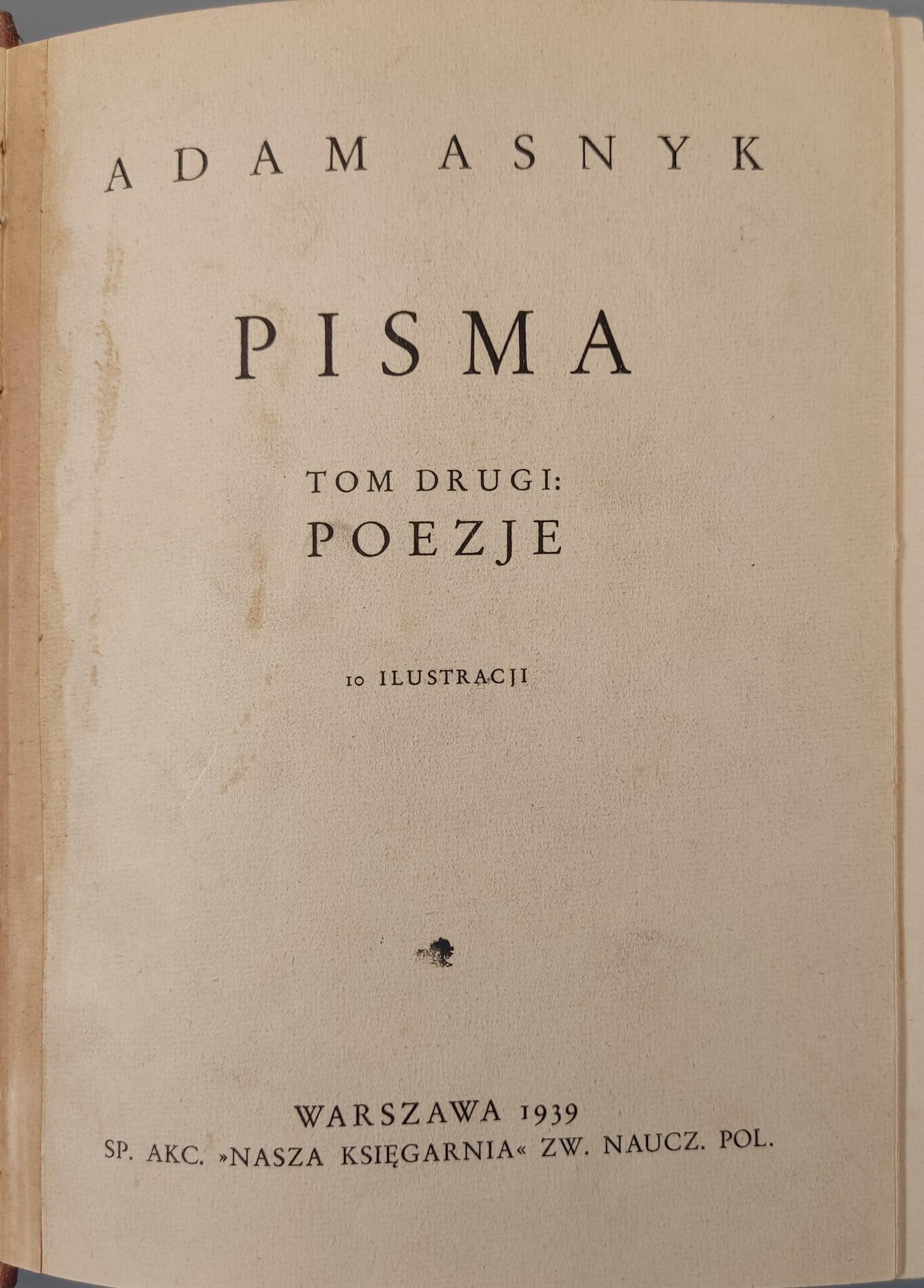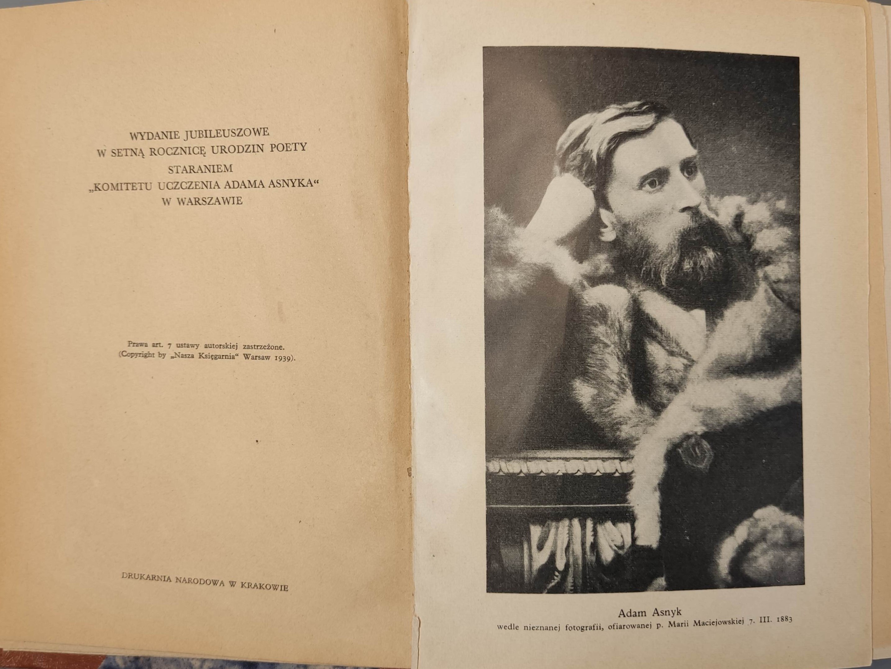 ILUSTRACJE. Wydanie jubileuszowe w setną rocznicę urodzin poety, staraniem ,,Komitetu uczczenia Adama Asnyka'' w Warszawie. Sp.Akc.Nasza Księgarnia, Zw.Naucz. Pol., Warszawa 1939.Oprawa półpł.(otarcia); ubytek dolnego rogu z tekstem na str.17/18; miejscami podkreślenia ołówkiem w tekście; przybrudzenia.