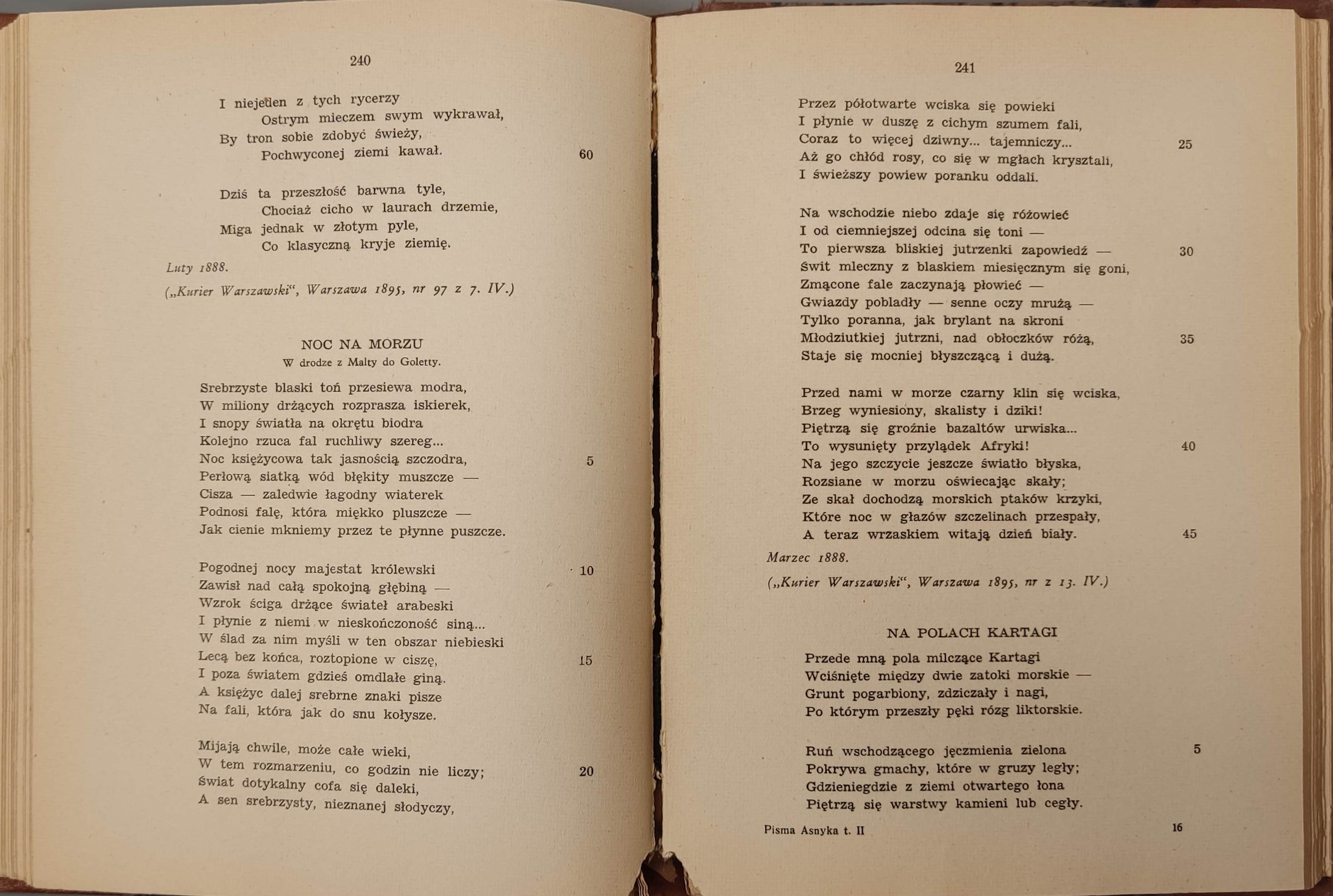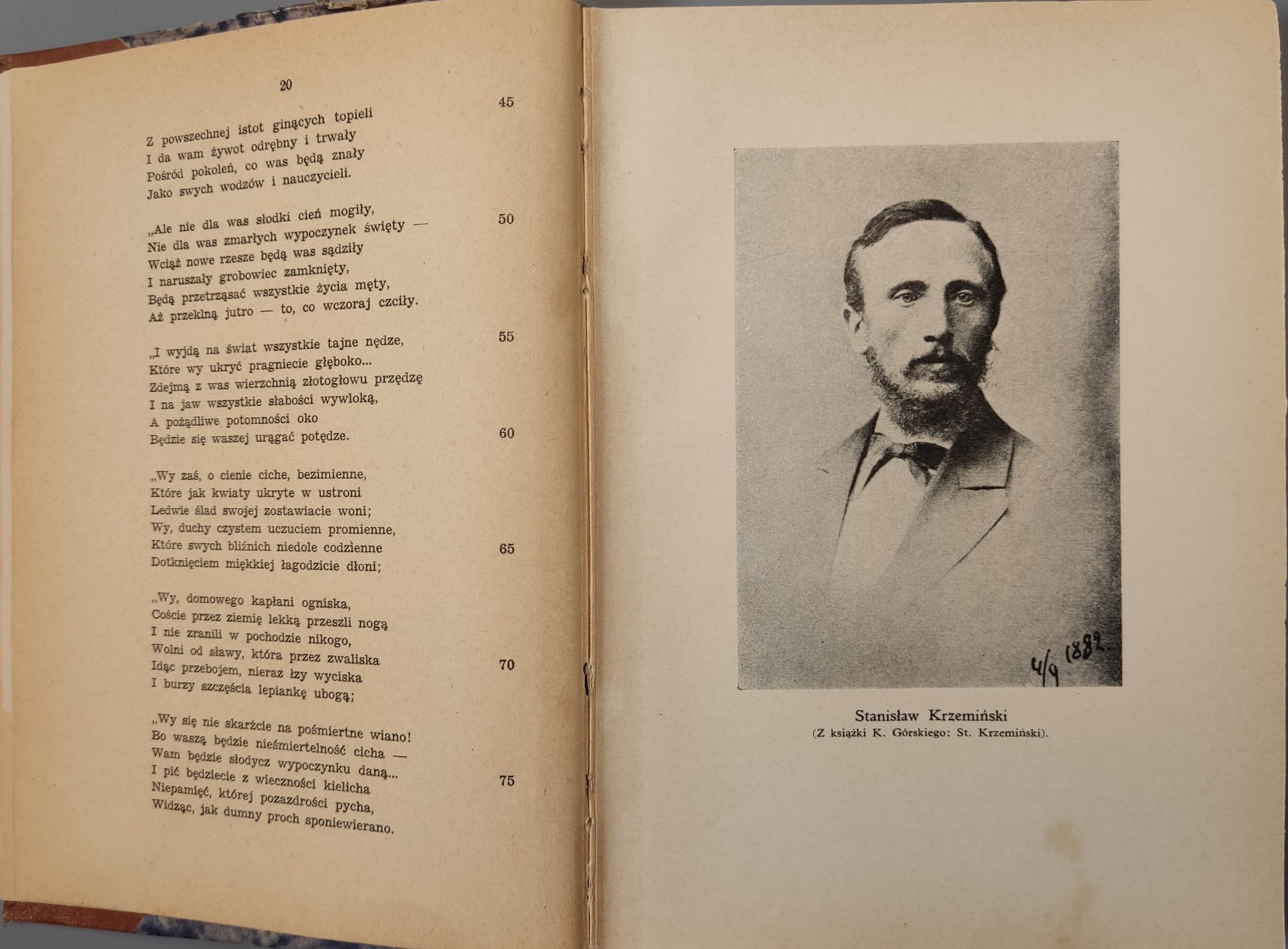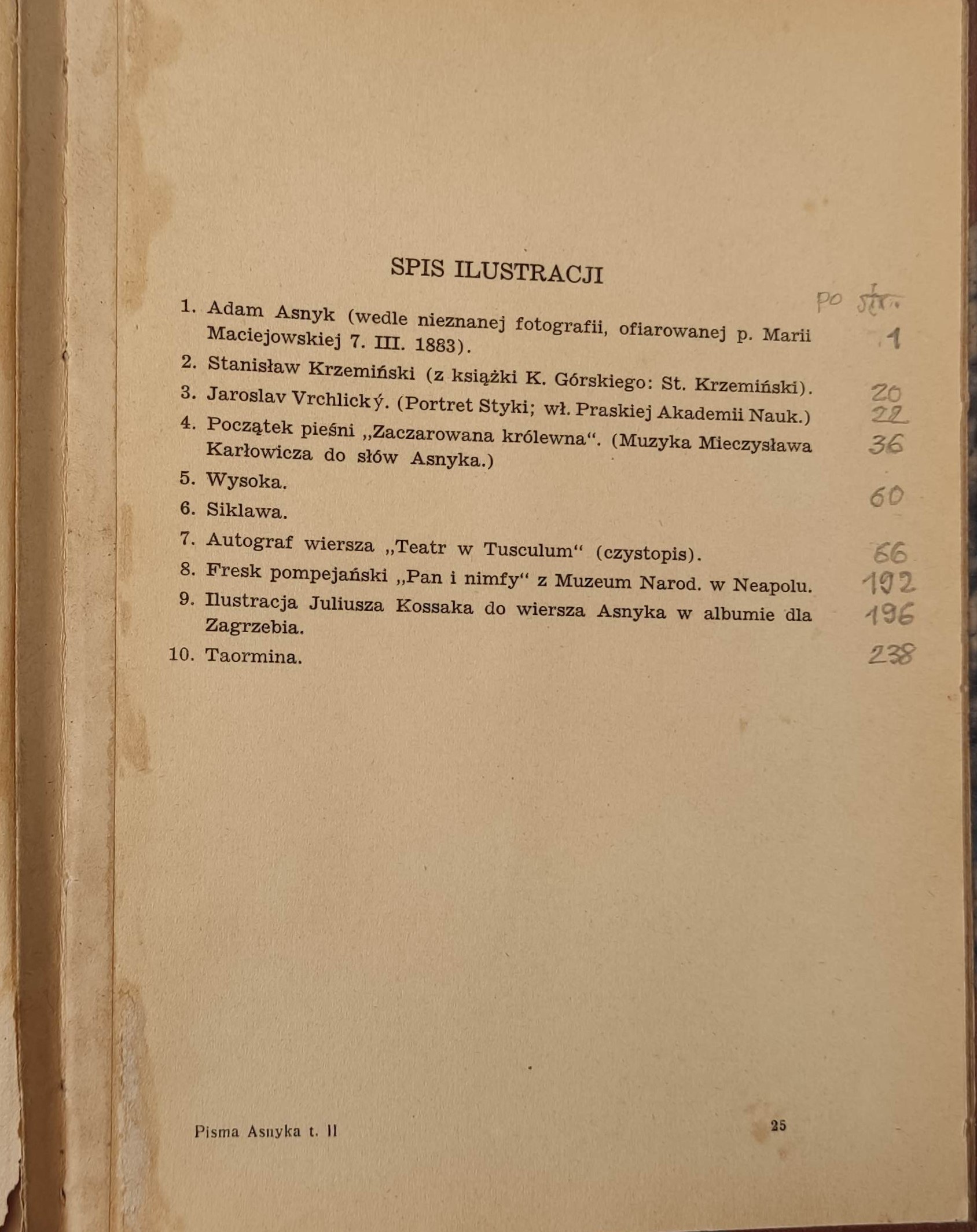 ILUSTRACJE. Wydanie jubileuszowe w setną rocznicę urodzin poety, staraniem ,,Komitetu uczczenia Adama Asnyka'' w Warszawie. Sp.Akc.Nasza Księgarnia, Zw.Naucz. Pol., Warszawa 1939.Oprawa półpł.(otarcia); ubytek dolnego rogu z tekstem na str.17/18; miejscami podkreślenia ołówkiem w tekście; przybrudzenia.
