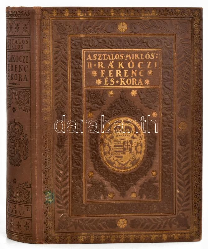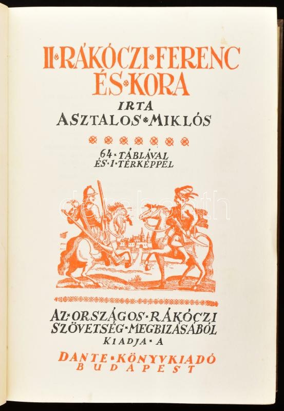 Asztalos Miklós: II. Rákóczi Ferenc és kora. Bp., 1934, Dante,(Hornyánszky Viktor-ny.), 492 p.+ 32 t. (képtáblák) + 1 (kihajtható térkép) t. Kiadói aranyozott egészvászon-kötés, kissé kopott borítóval,