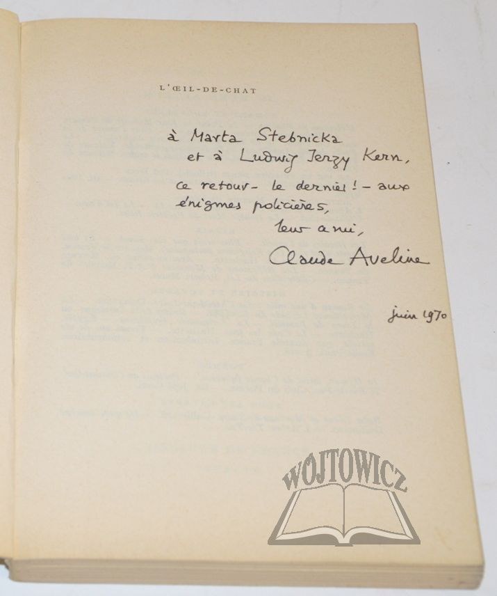AVELINE Claude - L'Oeil-de-chat. Paryż 1970. Mercure de France. 8, s. 247, [3], okł. brosz. oryg. Oko kota. Romans, zawiera m. in. rozdziały: Trzy dźwięki w deszczową noc; Porady sekretarki; Do Augusty; Powrót do Lyonu; Dwie niezwykłe kobiety. Na karcie przedtyt. odręczna dedykacja Autora dla Marty Stebnickiej i Ludwika Kerna. Stan dobry, przybrudz. i niew. otarcia okł.