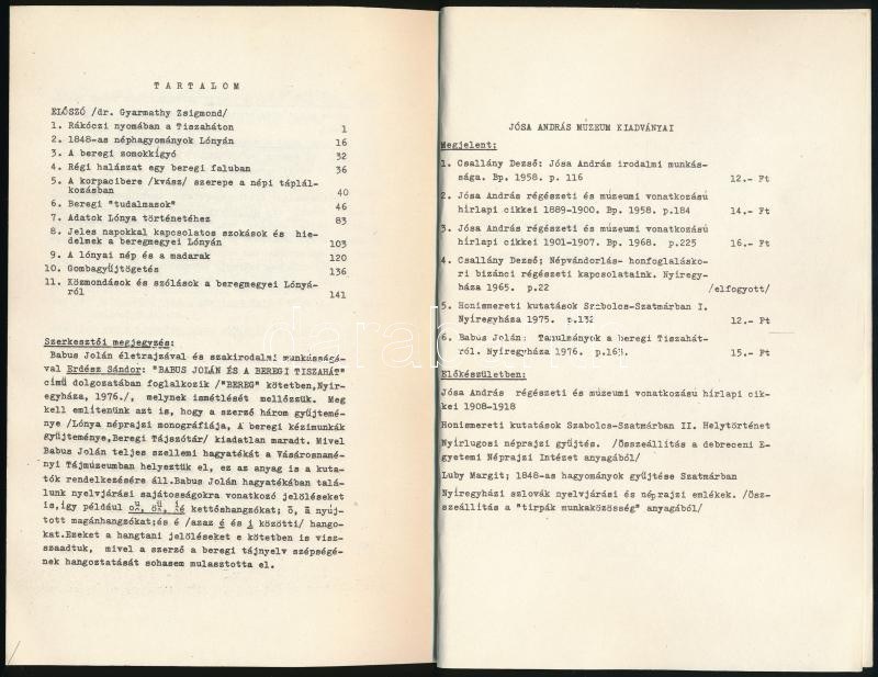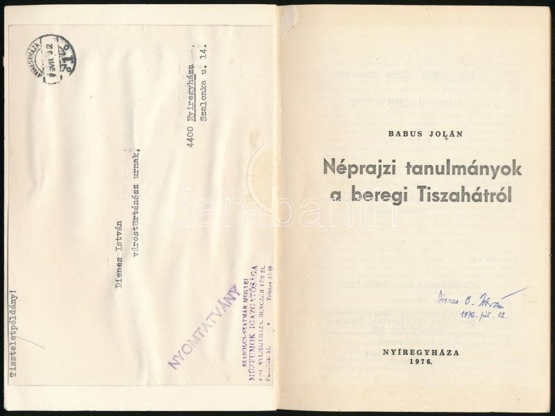 Babus Jolán: Néprajzi tanulmányok a beregi Tiszahátról. A kötet anyagát sajtó alá rendezte: Erdész Sándor. Jósa András Múzeum Kiadványai 6. Nyíregyháza, 1976, Jósa András Múzeum,(Szabolcs-Szatmár Megyei Tanács Sokszorosító Költségvetési Üzem-ny.), 163+3 p. Kiadói papírkötés. Megjelent 600 példányban. Dienes István (1929-1995) régész, muzeológus tiszteletpéldánya, valamint névbejegyzésével.