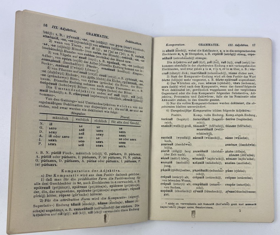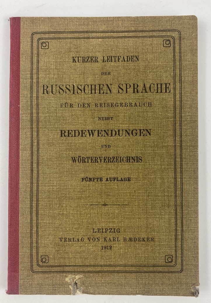 Baedeker Karl, Kurzer Leitfaden der Russischen Sprache für den Reisegebrauch: Nebst Redewendungen und Wörterverzeichnis [Krótki przewodnik po języku rosyjskim do użytku w podróży: z idiomami i słownikiem], Karl Baedeker, Lipsk 1912, s. 100, wymiary 11 x 16 cm. Okładka płócienna, wydawnicza. Uszkodzenie okładki oraz pierwszych 30 kart. naddarcie strony tytułowej. Niewielkie otarcia okładki.
