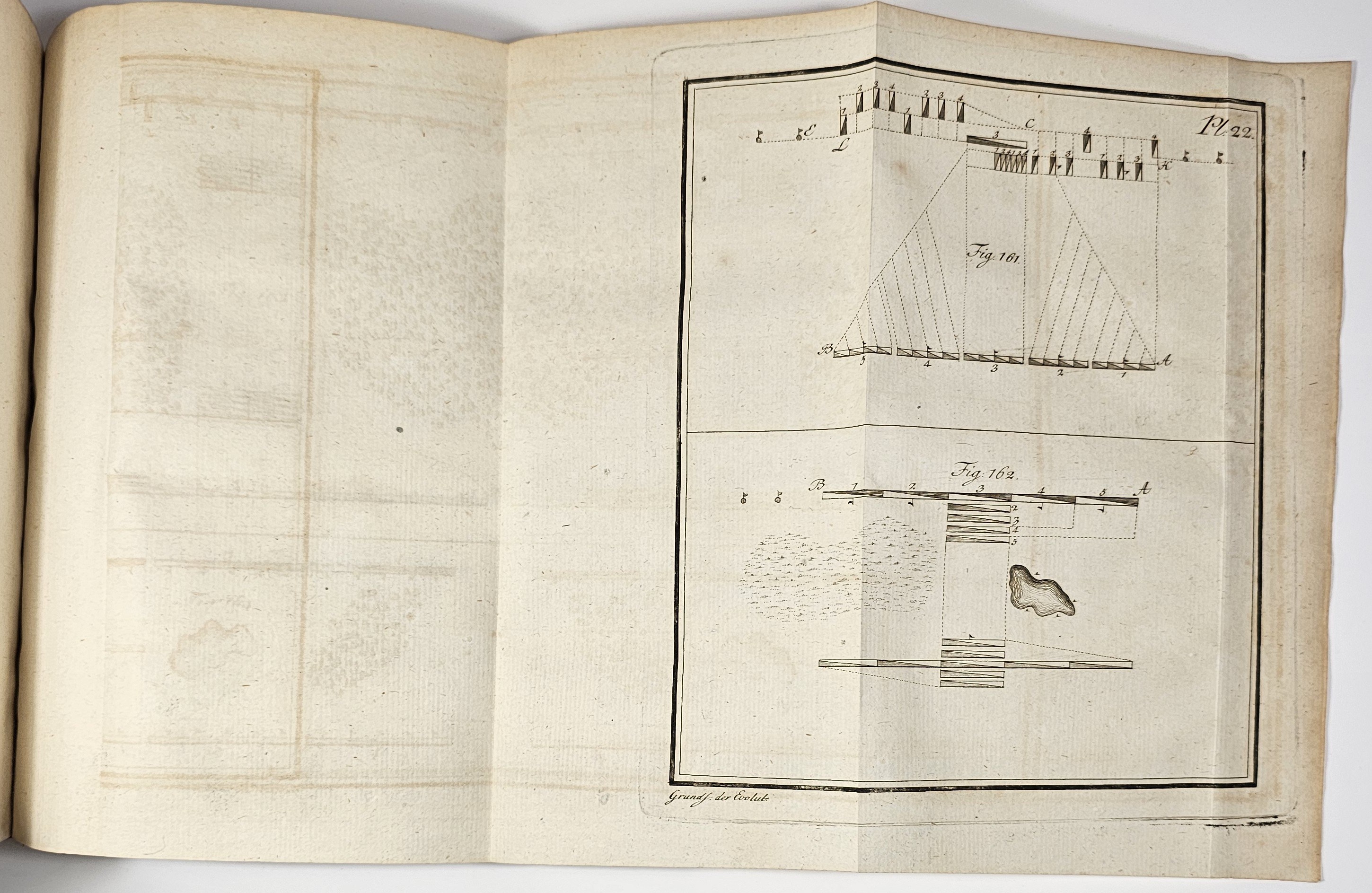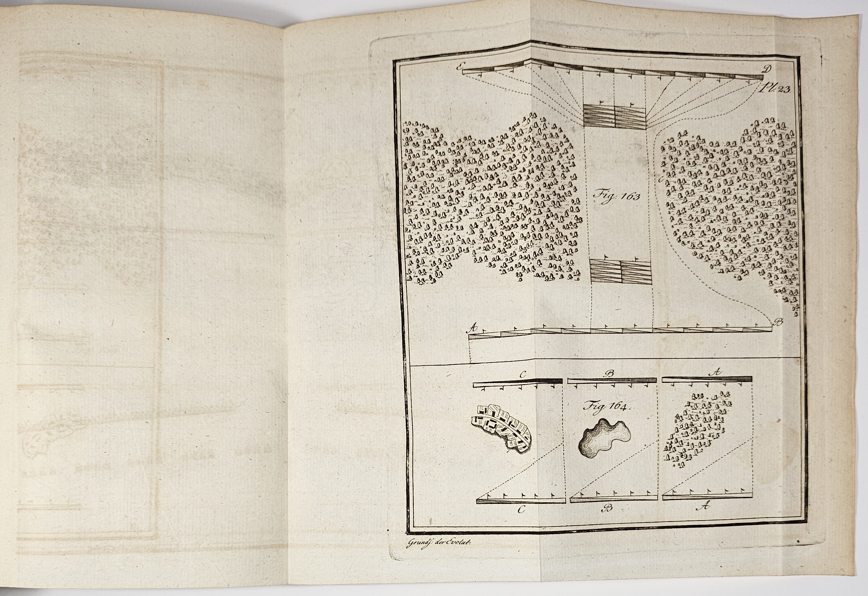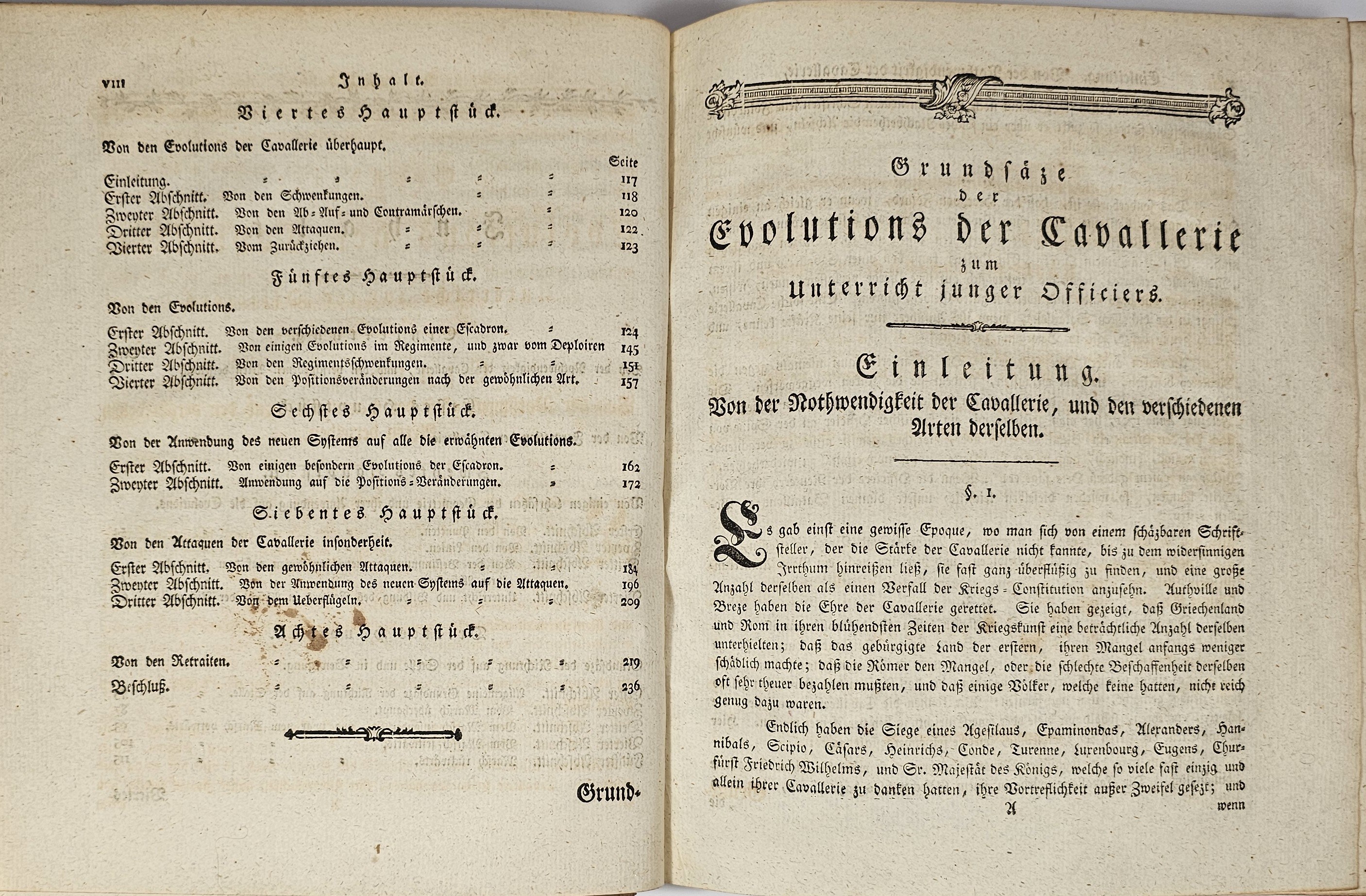 23.5 cm, s. VIII, 238, [1], 38 rozkładanych tablic, opr. psk. z epoki: grzbiet 6polowy, z ozdobnym szyldzikiem ze złoconą tytulaturą. Stan bardzo dobry. Z kompletem tablic. Pierwsze i jedyne wydanie obszernego traktatu o ruchach i rozmieszczeniu kawalerii podczas manewrów i ataków w polu. Osiem rozdziałów obejmuje min.: konstruowanie formacji, geometrię i jej zastosowanie w ewolucjach, atakach i odwrotach.