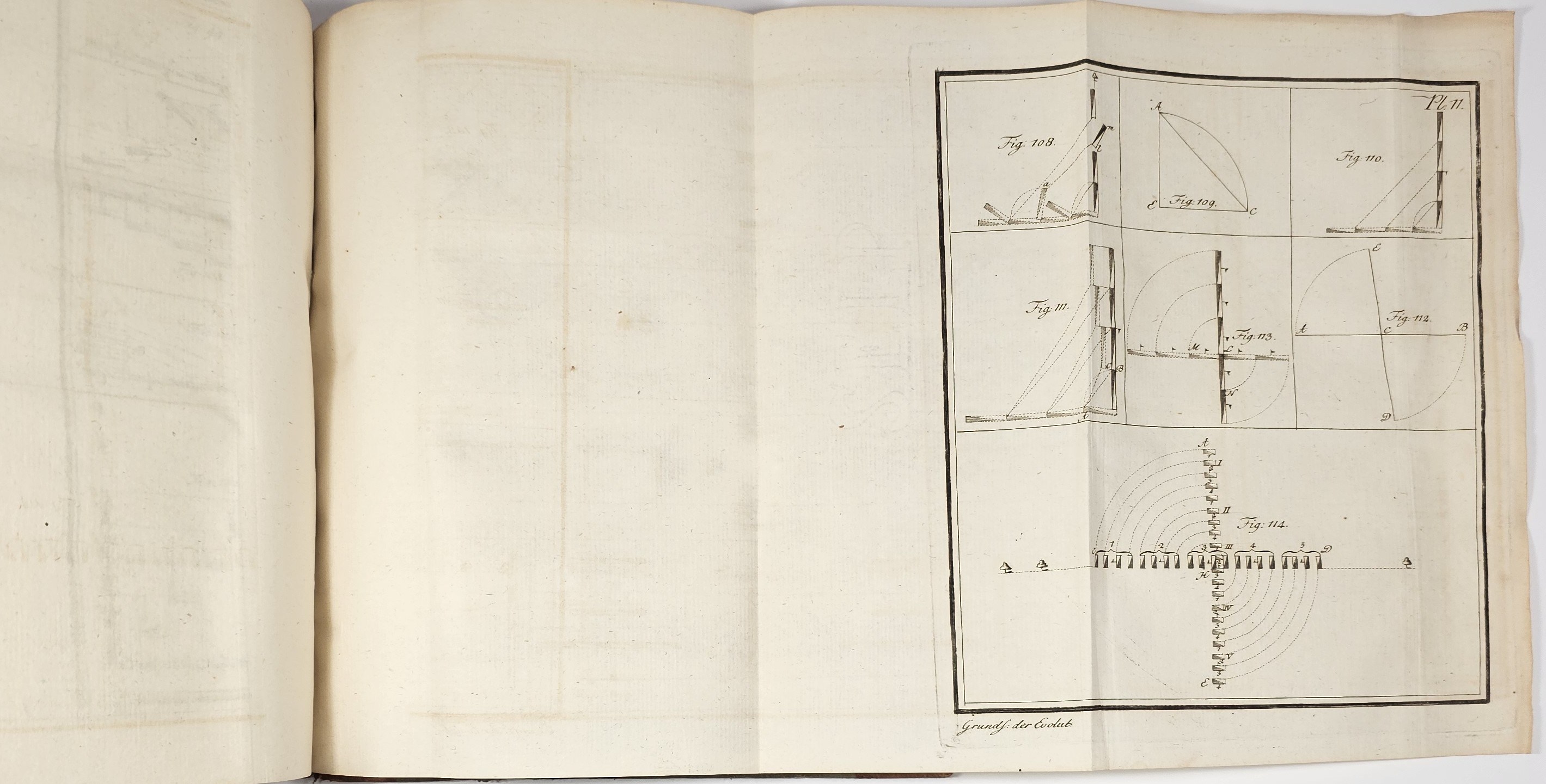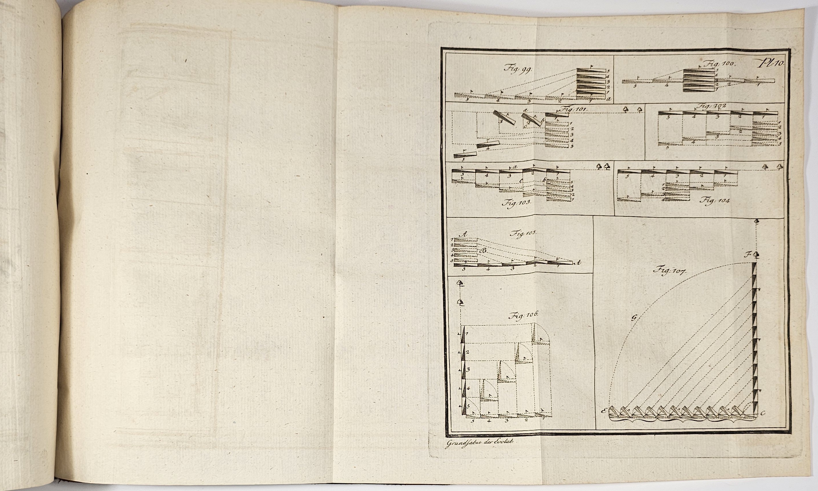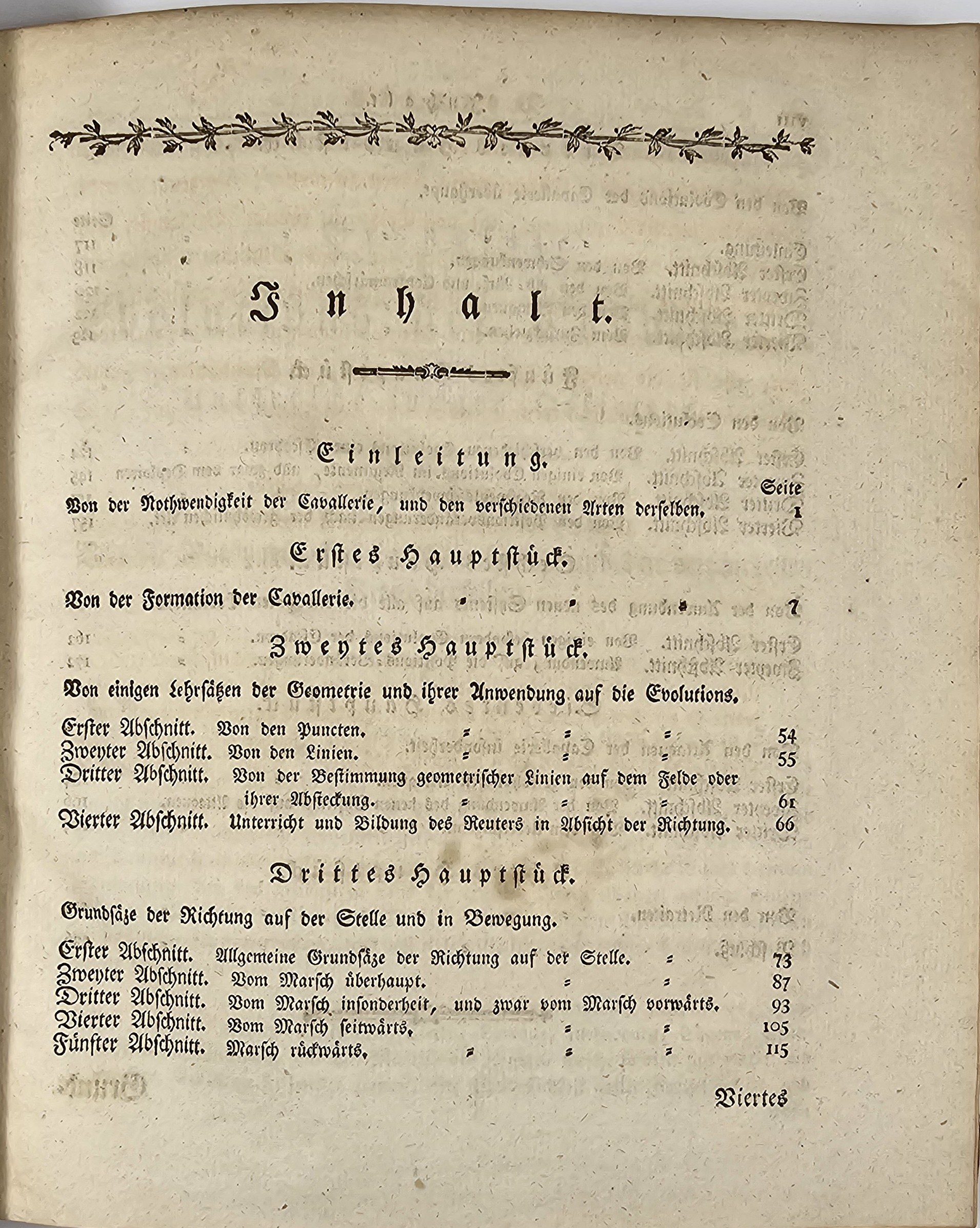 23.5 cm, s. VIII, 238, [1], 38 rozkładanych tablic, opr. psk. z epoki: grzbiet 6polowy, z ozdobnym szyldzikiem ze złoconą tytulaturą. Stan bardzo dobry. Z kompletem tablic. Pierwsze i jedyne wydanie obszernego traktatu o ruchach i rozmieszczeniu kawalerii podczas manewrów i ataków w polu. Osiem rozdziałów obejmuje min.: konstruowanie formacji, geometrię i jej zastosowanie w ewolucjach, atakach i odwrotach.