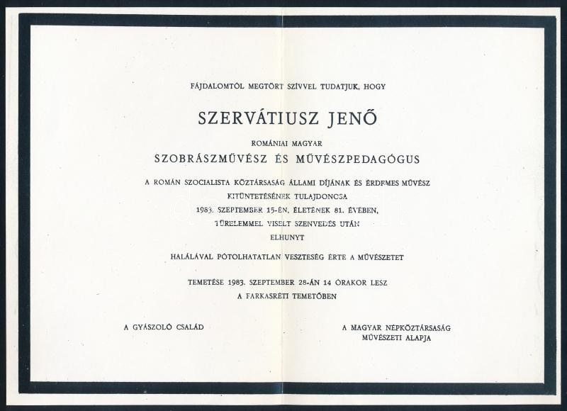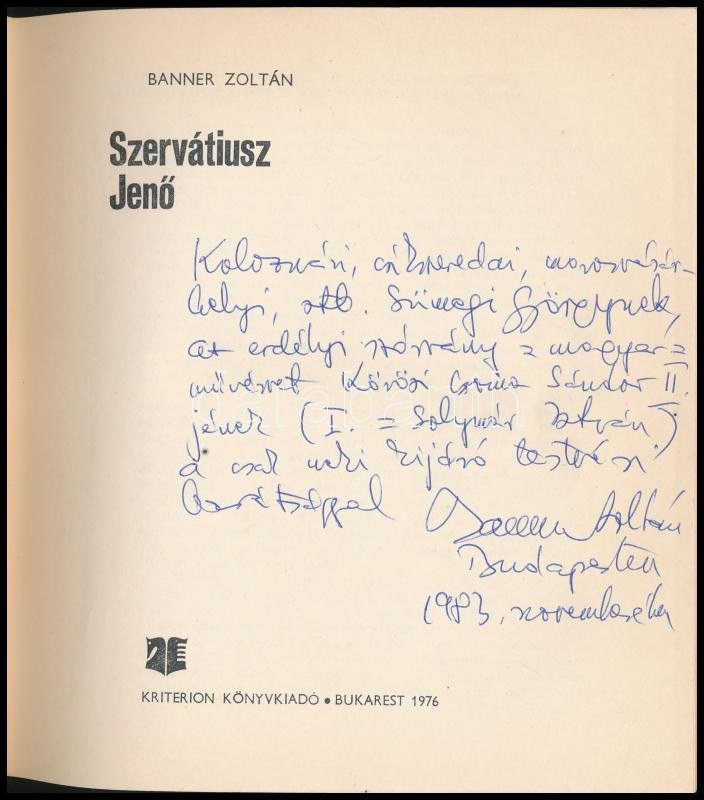 Banner Zoltán: Szervátiusz Jenő. A szerző, Banner Zoltán (1932-) művészeti író által Sümegi György (1947-) művészettörténésznek DEDIKÁLT példány! Bukarest, 1976, Kriterion. A művész, Szervátiusz Jenő (1903-1983) szobrászművész műveinek reprodukcióival gazdagon illusztrált. Benne Szervátiusz Jenő halálozási értesítőjével, valamint számos újságkivágással. Kiadói egészvászon-kötésben, kiadói kissé szakadt papír védőborítóban