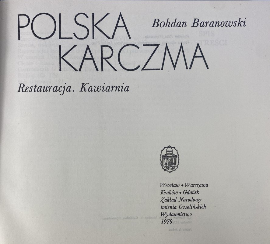Baranowski Bohdan, Polska karczma: restauracja, kawiarnia, Zakład Narodowy im. Ossolińskich, Wrocław [etc.] 1979, s. 136, [3], IV k. tabl. kolor., [100] s. tabl., wymiary 21,5 x 19 cm. Okładka płócienna z oryginalną obwolutą. Otarcia, niewielkie zabrudzenia obwoluty.
