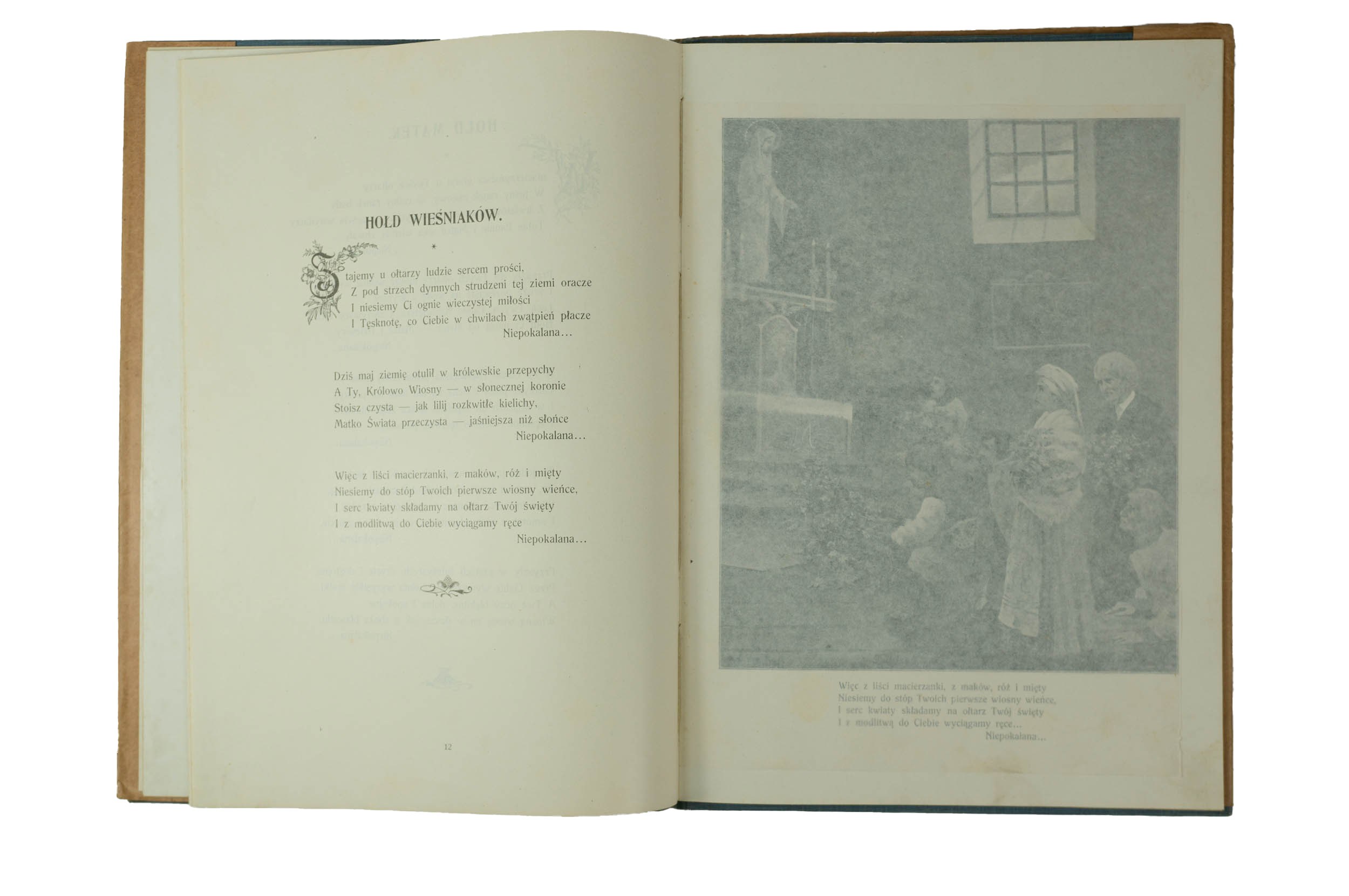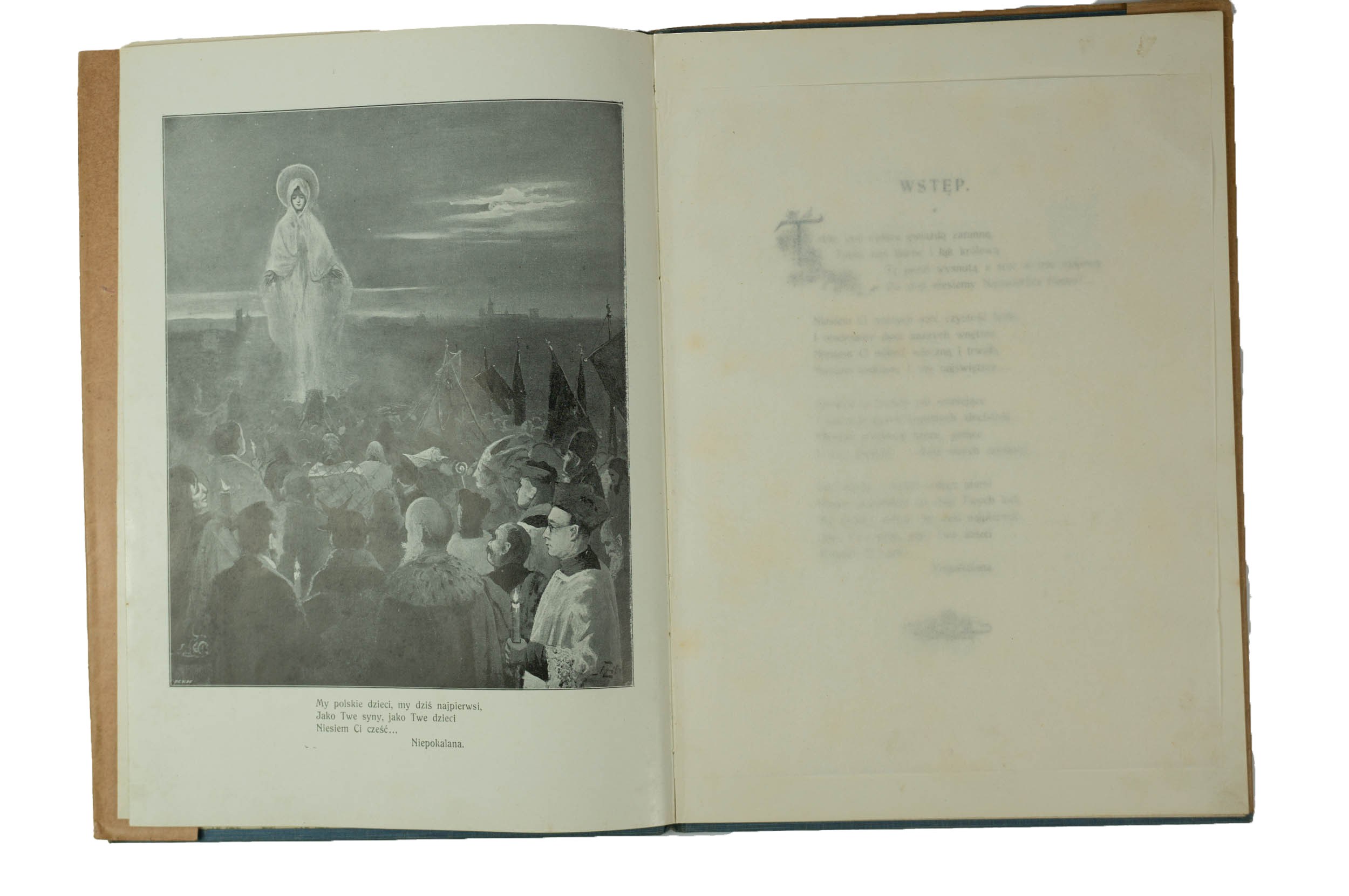 NIEPOKALANA. Pamiątka jubileuszowa redakcyi "Prawdy" 1854 - 8.XII. - 1904, napisał Stanisław Berdyszyński, zilustrował Franciszek Zamian, wydał X. Melchior Kądzioła, nakładem redakcyi "Prawdy", druk "Katolika" Spółki Wyd. z ogr. odpow. w Bytomiu G-Ś., f. 21 x 29,5cm, s. 24