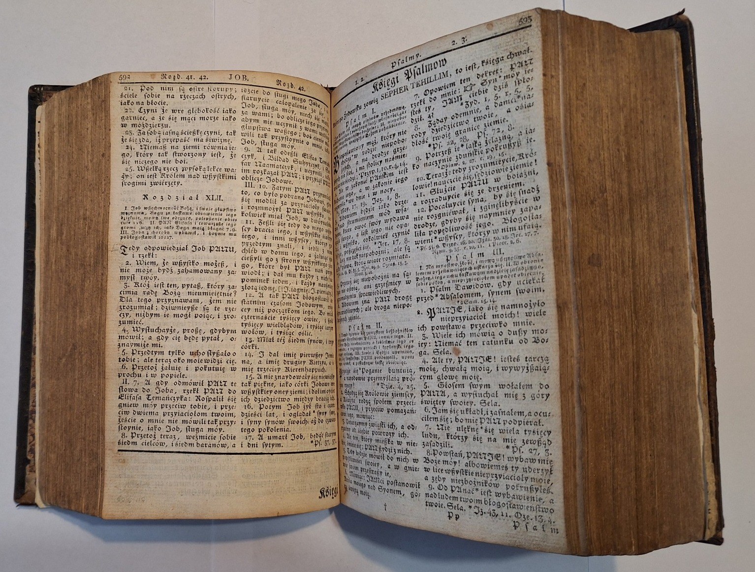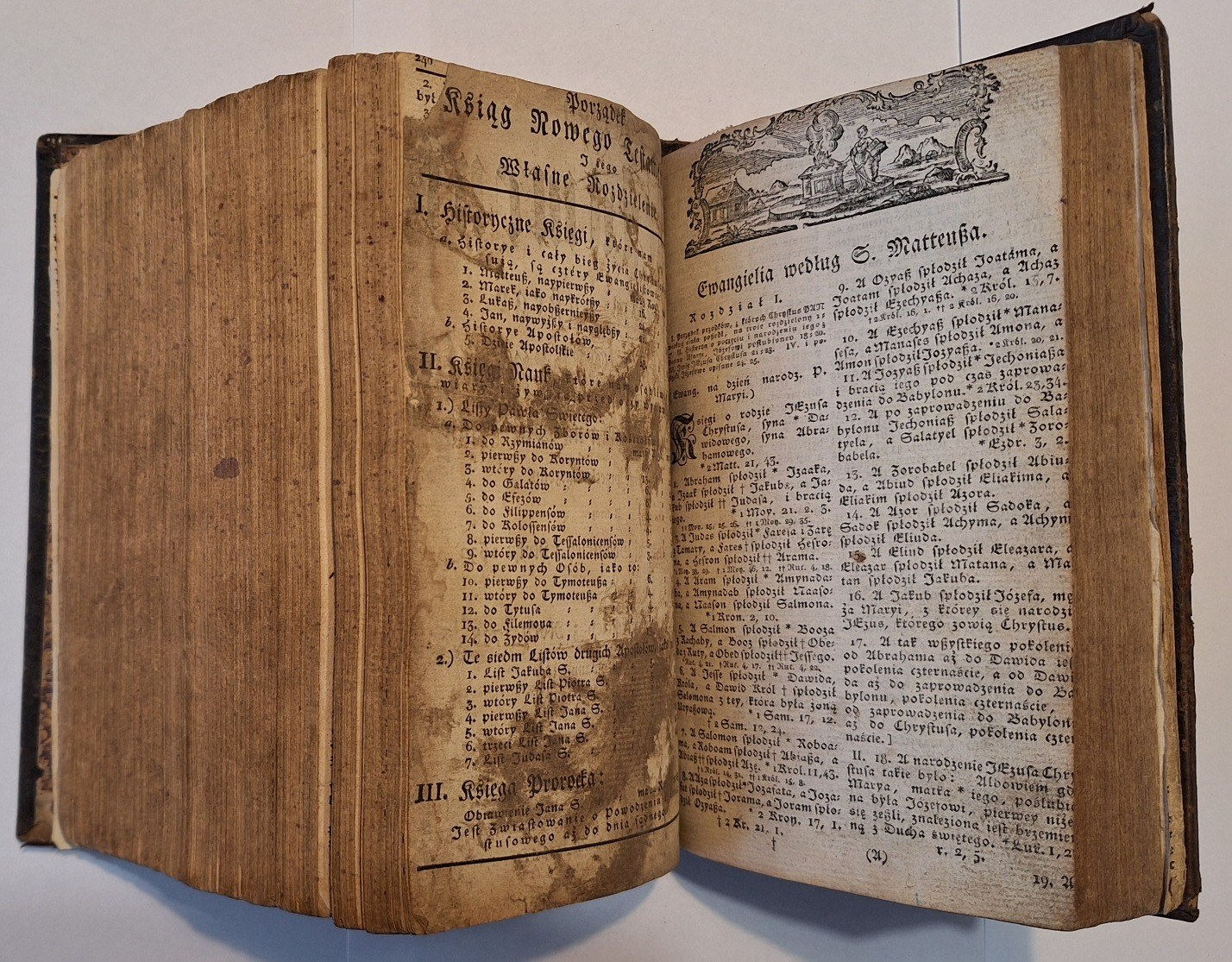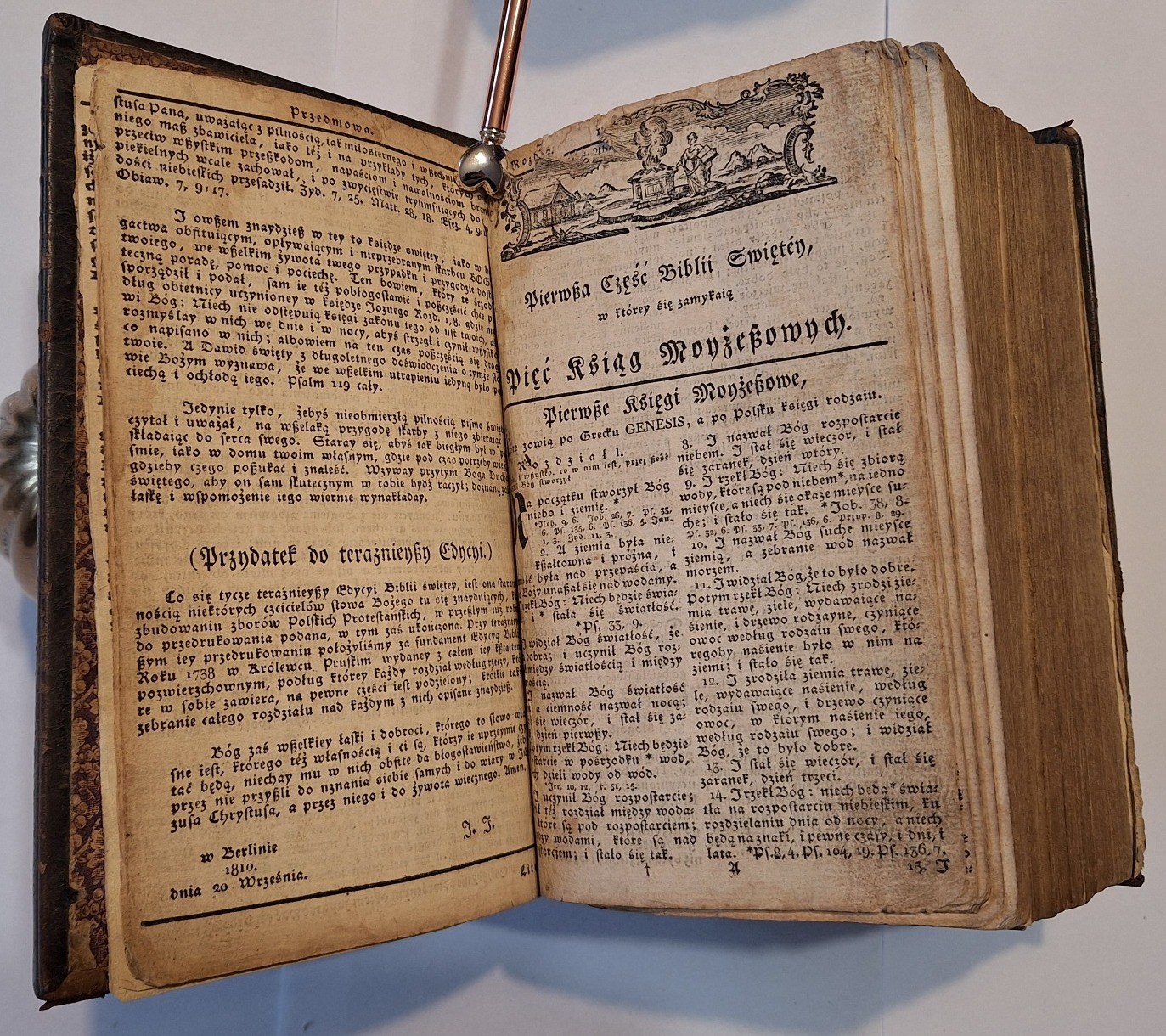 Biblia Gdańska, Biblia to iest Wszystko Pismo Swięte Starego i Nowego Przymierza według Edycyi Biblii Gdańskiey w Roku 1632 wydaney, Berlin w drukarni C.F.E. Spathen, 1810, wym. 16°, s. [7], 968, 240, 307, [s.3], 15. Język polski. 2 niewielkie drzeworyty w tekście, Oprawa skórzana z epoki.