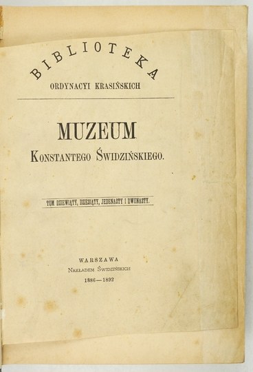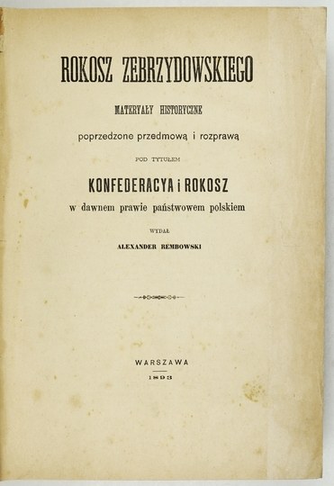 BIBLIOTEKA Ordynacyi Hr. Krasińskich. Muzeum Konstantego Świdzińskiego. T. 9-12: Rokosz Zebrzydowskiego. Materyały historyczne poprzedzone przedmową i rozprawą pod tytułem Konfederacya i rokosz w dawnem prawie państwowem polskiem. Wyd. A. Rembowski. Warszawa 1893. Druk. E. Lubowskiego i S-ki. 4, s. [4], XXX, [2], 314, [1], 535. opr. wsp. ppł.