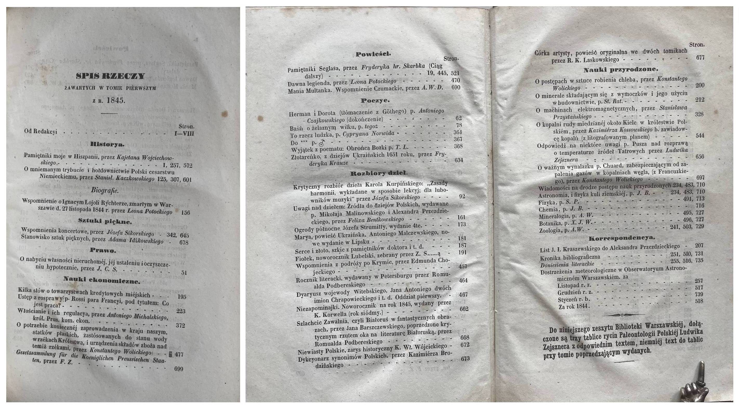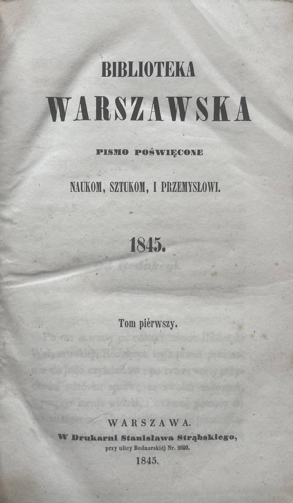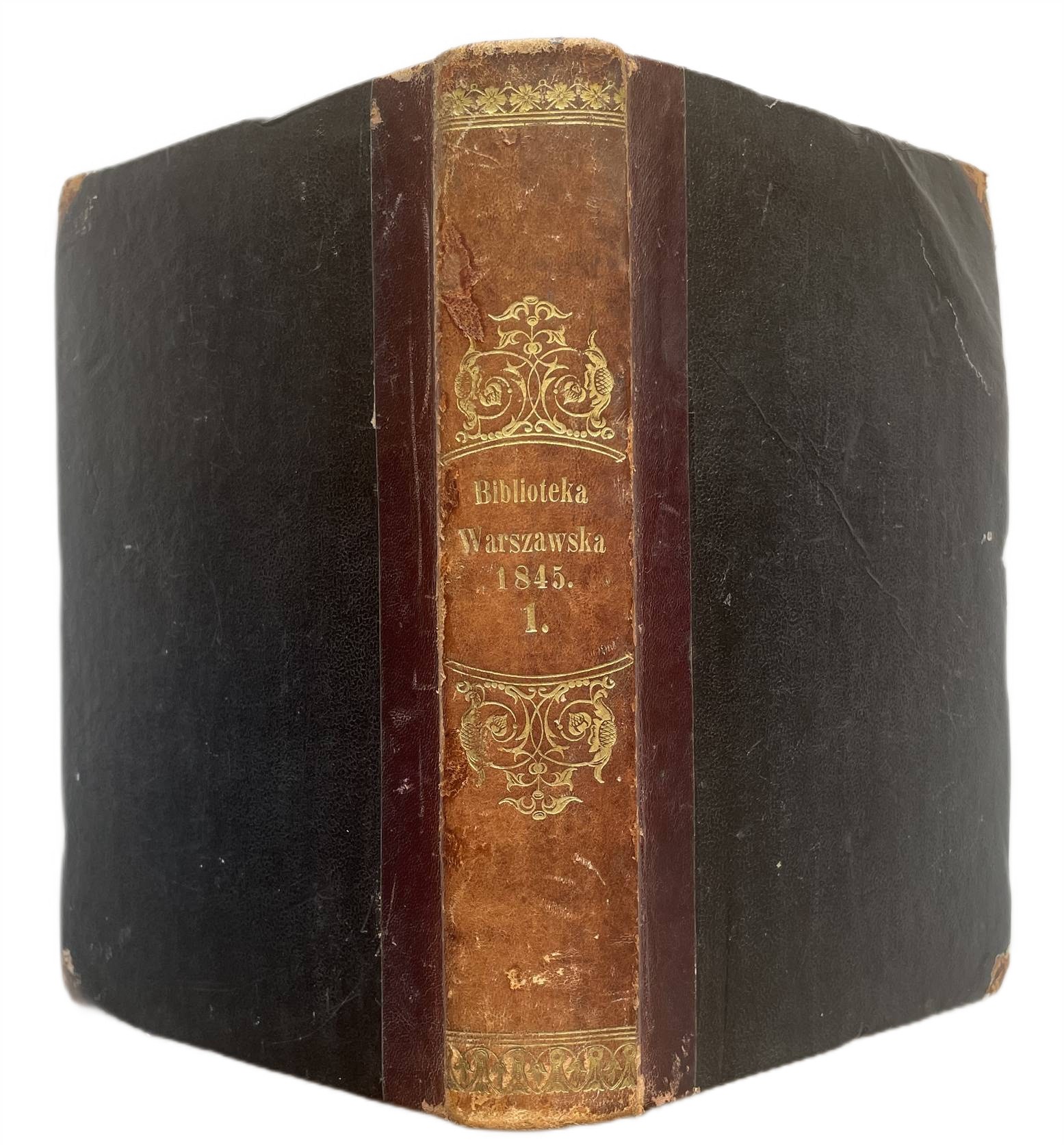 Biblioteka Warszawska. Pismo poświęcone naukom, sztukom i przemysłowi. Rok 1845 tom pierwszy. Warszawa 1845, w Druk. St. Strąbskiego. 21 cm, str. VIII, 738, [8], 1 skł. tabl. ryc., 1 skł. tabela. Oprawa z epoki płsk. złoc., niew. otarcia krawędzi, poza tym stan b. dobry.