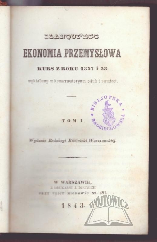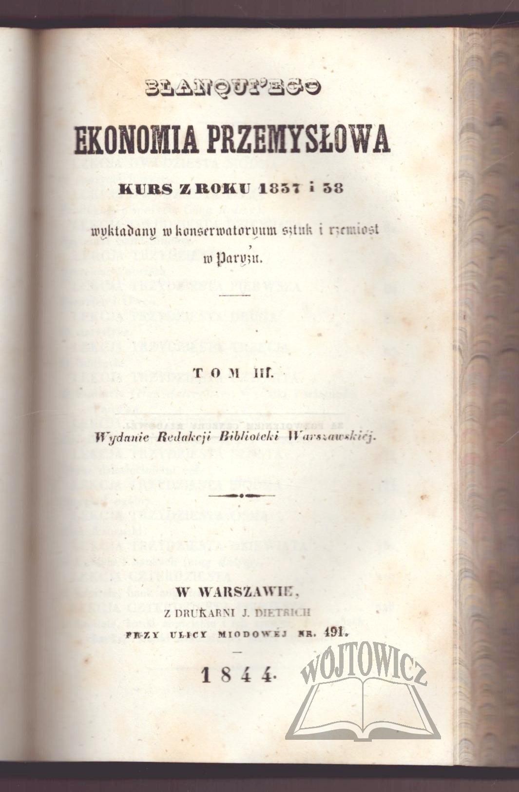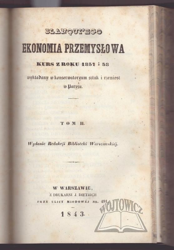 Kurs z roku 1837 i 38 wykładany w konserwtorium sztuk i rzemiosł w Paryżu. Tom 1-3 w 1 wol. Wydanie Redakcyi Biblioteki Warszawskiej. Warszawa 1843-1844. Z Drukarni J. Dietrich. 8, s. VI, [2], 257, [9], 240, [6], 240, opr. psk. z epoki, złoc. napisy na grzbiecie.