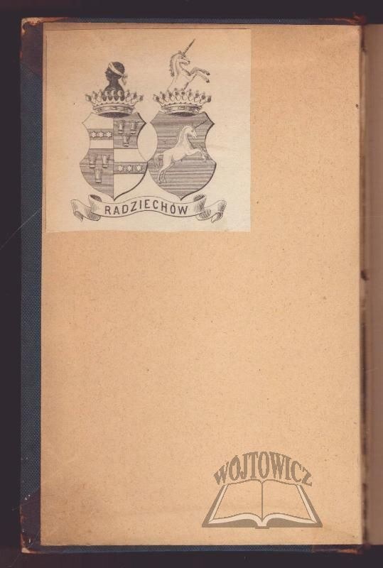 Na wyklejce exlibris herbowy Mier i Bończa oraz nadruk Radziechów. Pieczęcie herbowe "Biblioteka Radziechowska". Na okładce nalepka biblioteczna - "Bibljoteka Radziechowska". Otarcie i niew. zabrudz. opr., pieczątka, rdzawe plamy na kartach. Stan dobry. Zawiera m. in.: Kapitał. Podatek. Renta. Zyski od kapitału; Ubóstwo. Ludność; Moneta; Rolnictwo; Wielki i mały przemysł; Organizacja handlu we Francji; O wykonaniu kolei żelaznych; O spożyciu bogactw; System Fouriera; O statystyce; O budżecie; Związki geografji z ekonomją polityczną i inne.