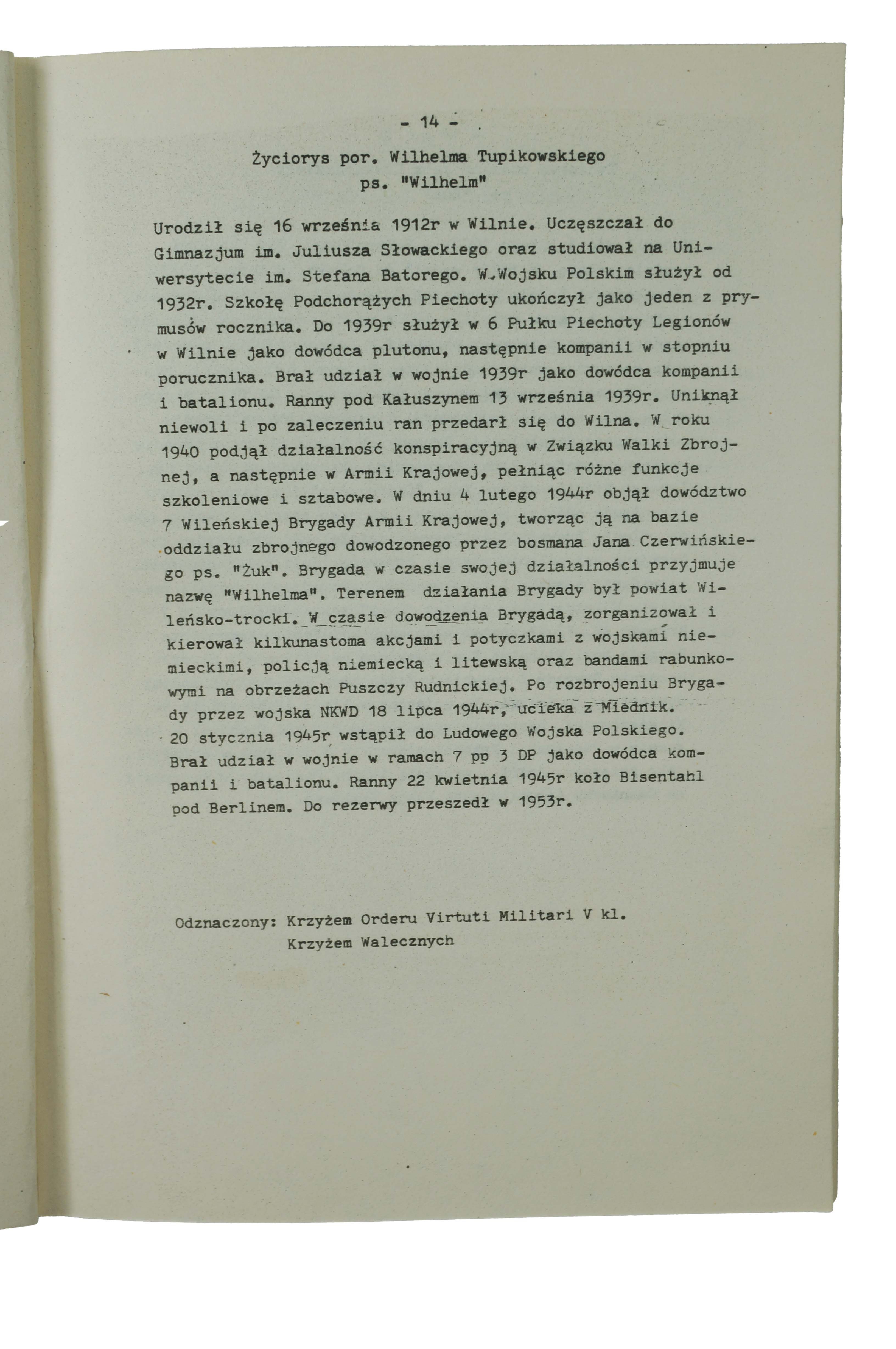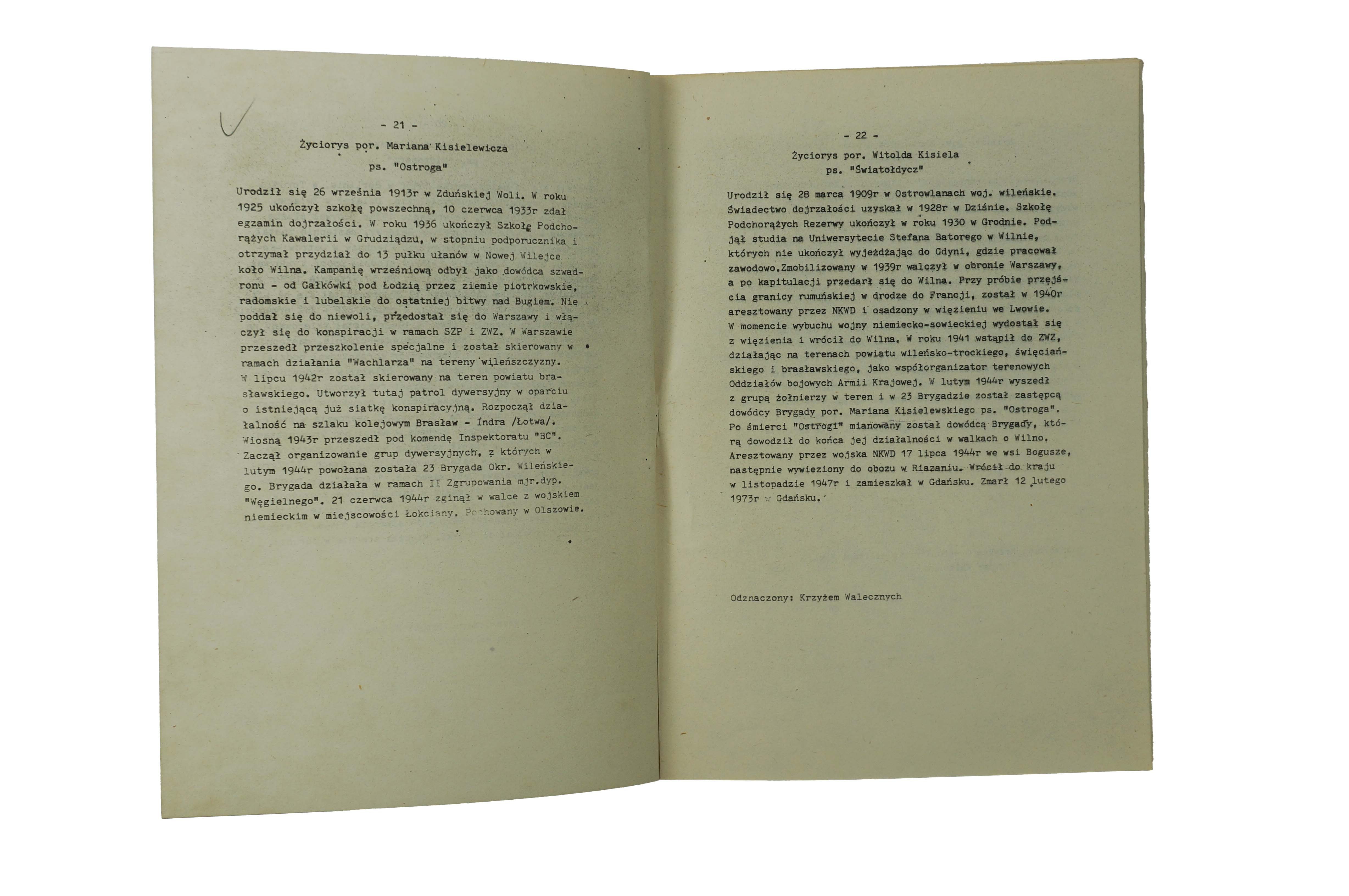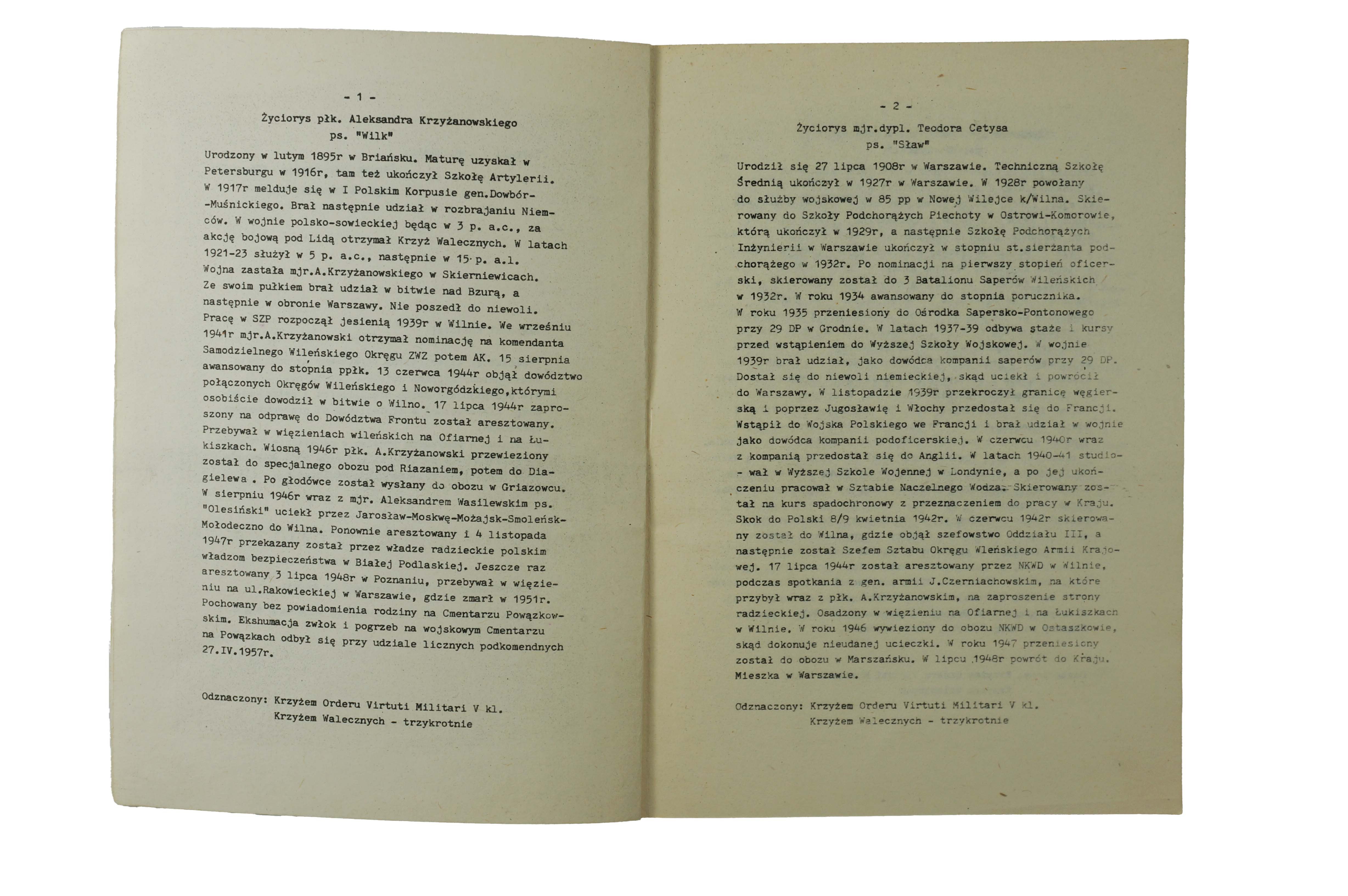 życiorysy: płk. Aleksandra Krzyżanowskiego ps. "Wilk", mjr. dypl. Teodora Cetysa ps. "Sław", mjr. Antoniego Olechnowicza ps. Pohorecki", mjr. dypl. Mieczysława Potockiego ps. "Węgielny", mjr. Aleksandra Wasilewskiego ps. "Olesiński", mjr. Czesława Dębickiego ps. 'Jarema:, ppor. Antoniego Burzyńskiego ps. "Kmicin", kpt. Czesława Grombczewskiego ps. "Jurand", kpt. Gracjana Fróga ps. "Szczerbiec", kpt. Longina Wojciechowskiego ps. "Ronin", mjr. Zygmunta Szyndzielarza ps. "Łupaszko", mjr. Granciszka Koprowskiego ps. "Dąb" - "Konar", kpt. Adama Baryczki ps. "Brona", "Tońko", por. Wilhelma Tupikowskiego ps. Wilhelm", bosmana Jana Czerwińskiego ps. "Żuk", kpt. Witolda Turonka ps. "Tur", chor. Jana Kolendo ps. Mały", kpt. Jana Dubois-Dubińskiego ps. "Gracz", kpt. Hieronima Romanowskiego ps. "Cerber", por. Adama Walczaka ps. "Nietoperz", por. Mariana Kisielewicza ps. "Ostroga", por. Witolda Kisiela ps. Światołdycz", por. Kazimierza Krauze ps. Wawrzecki", por. Witolda Kiewlicza ps. "Wujek"por, Władysława Kitowskiego ps. "Grom"