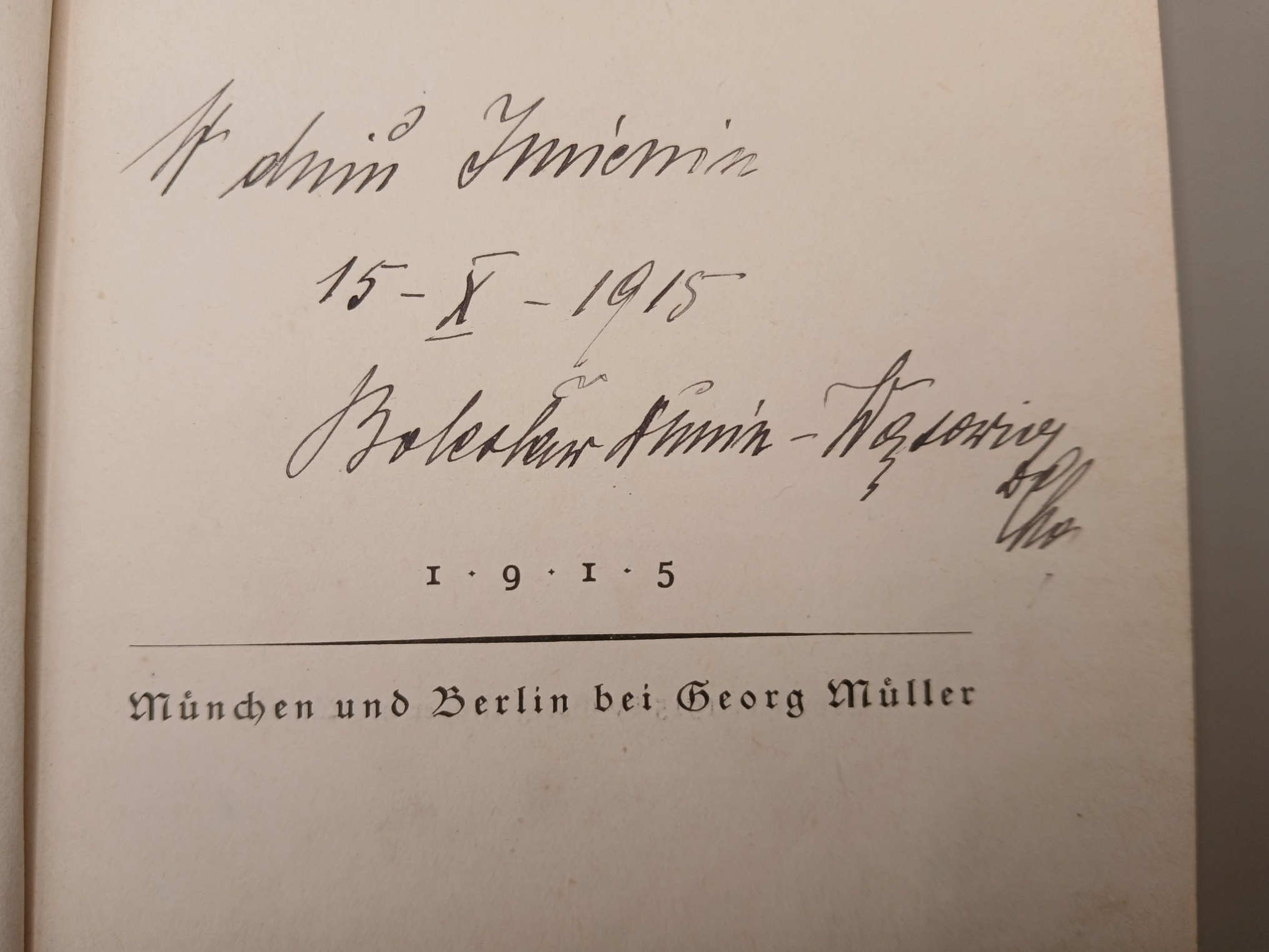 Książka była prezentem od niego dla niezidentyfikowanego solenizanta (świętującego prawdopodobnie 15 października) o czym zaświadcza dedykacja z 1915 roku.