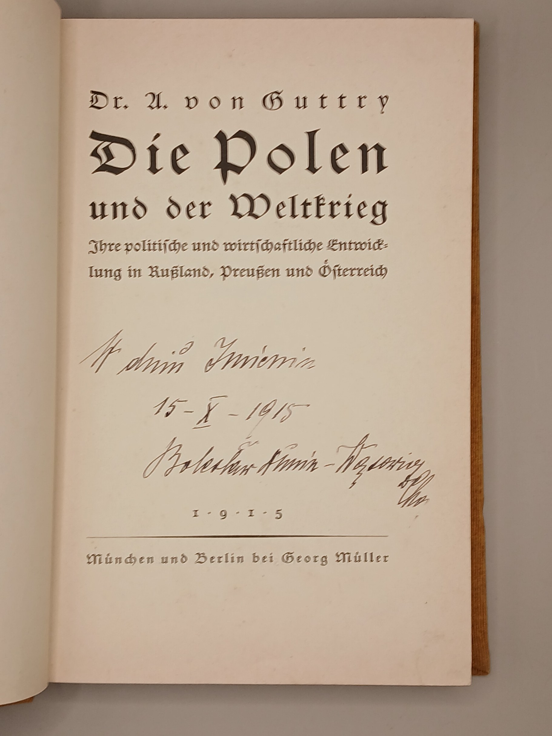 ALEKSANDER GUTTRY. Die Polen und der Weltkrieg. Ihre politische und wirtschaftliche Entwicklung in Russland, Preussen und Österreich. Zweite Aufl. München-Berlin 1915. 21,5x14,4 cm; s. XVIII, 307, [5]. 3 mapy, oprawa twarda wydawnicza.