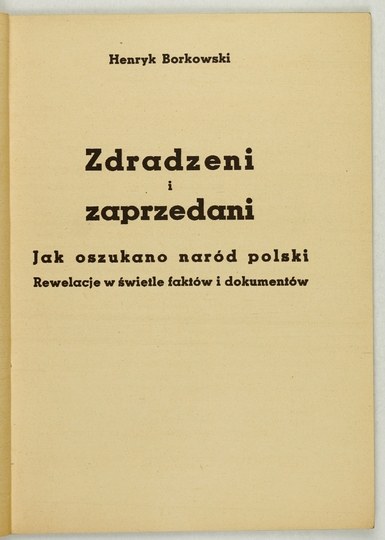 BORKOWSKI Henryk - Zdradzeni i zaprzedani. Jak oszukano naród polski. Rewelacje w świetle faktów i dokumentów. Warszawa 1940. Wyd. Nowoczesne. 8, s. 69, [2]. brosz. Seria Warszawska, t. 2.