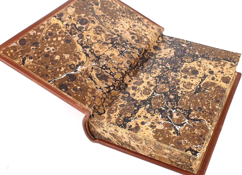 TWARDA OPRAWA PEŁNA SKÓRA WSPÓŁCZESNA, BOGATE ZŁOCENIA NA OBU LICACH, NA GRZBIECIE WYPUKŁE ZWIĘZY, DWA BARWNE SZYLDY, W POLACH EFEKTOWNE ZŁOCENIA; RĘCZNIE MARMORYZOWANY PAPIER MARMURKOWY NA WYKLEJKACH; OBCIĘCIA KART MARMORYZOWANE TYM SAMYM WZOREM. ZACHOWANE OKŁADKI BROSZUROWE TOMIKÓW