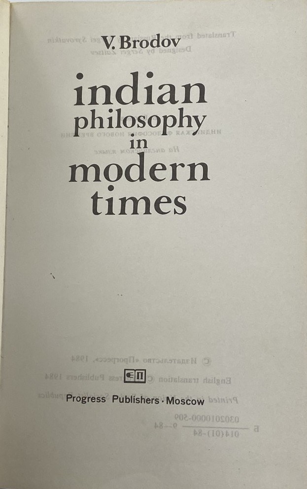 Brodov Vasilij Vasil'evič, Indian philosophy in modern times, Progress Publishers, Moscow 1984, s. 365, [2], wymiary 11,5 x 17,5 cm. Treść w języku angielskim. Okładka płócienna z oryginalną obwolutą. Niewielkie zabrudzenia obwoluty.