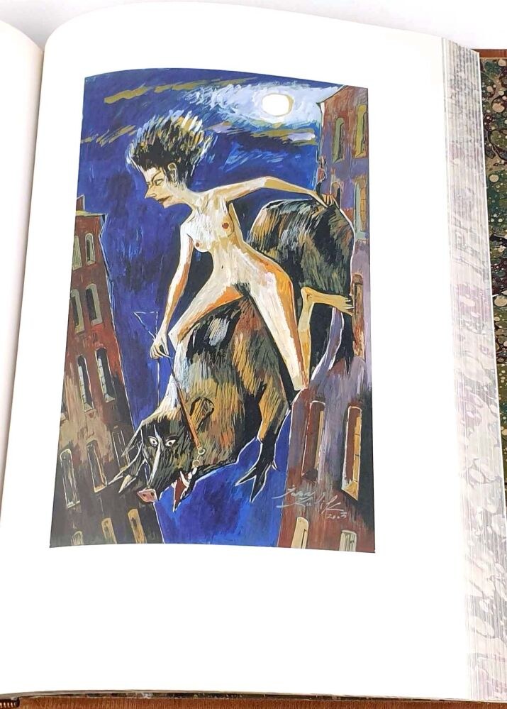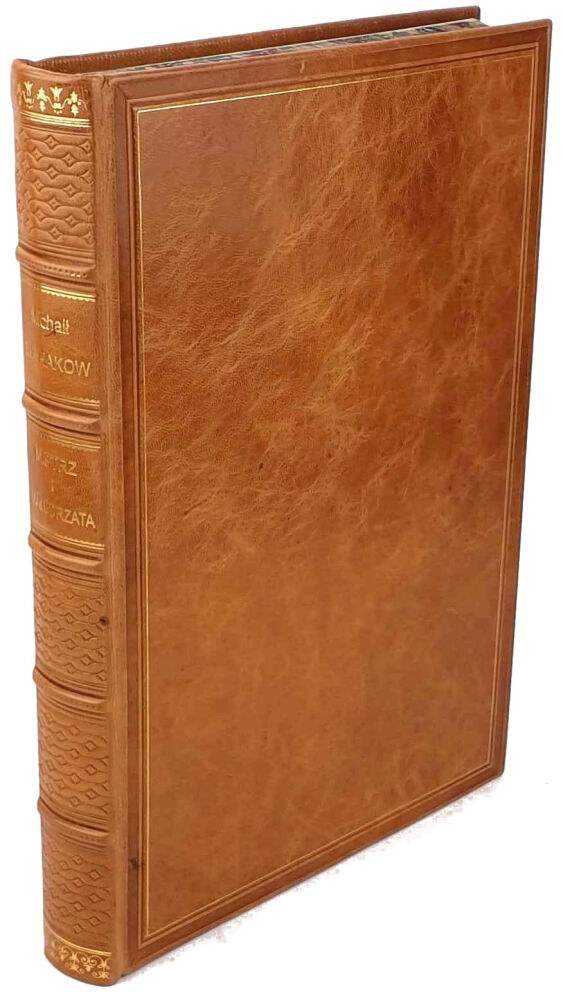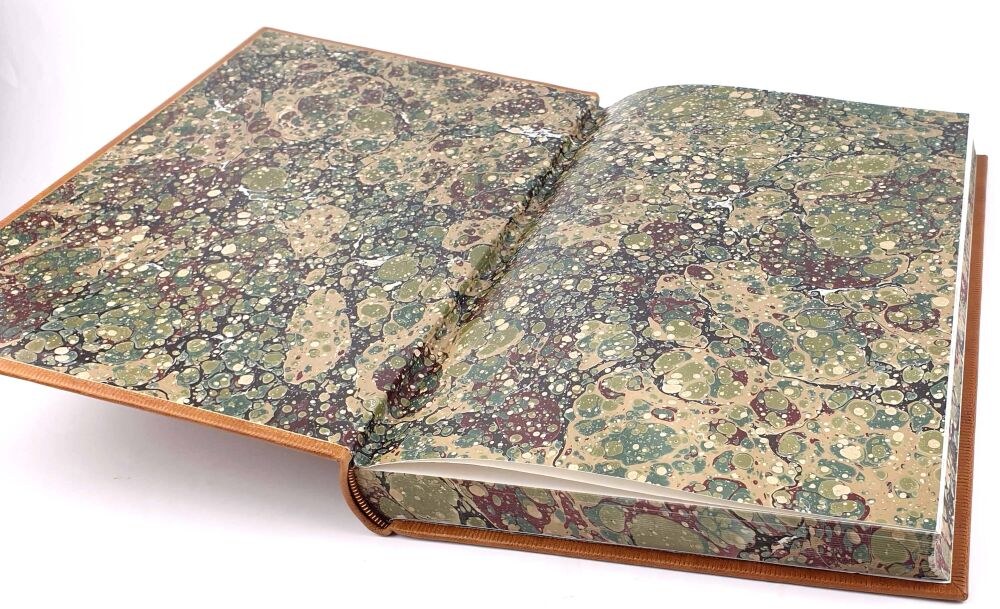 TWARDA OPRAWA PEŁNA SKÓRA WSPÓŁCZESNA. OKŁADKA OKOLONA SKROMNĄ TŁOCZONĄ NA ŚLEPO RAMKĄ. GRZBIET Z WYPUKŁYMI ZWIĘZAMI, GŁĘBOKIMI TŁOCZENIAMI, SZYLDAMI I ZŁOCENIAMI. WYKLEJKI Z RĘCZNIE BARWIONEGO W MASIE PAPIERU MARMORYZOWANEGO, OBCIĘCIA KART MARMORYZOWANE TYM SAMYM WZOREM.