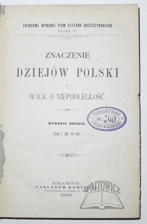 Znaczenie dziejów Polski i walk o niepodległość. Wyd. 2. Kraków 1894. Nakł. Komitetu. Czcionkami Drukarni Związkowej. 8, s. [2], 378, [6], opr. ppł. z epoki, zielone płótno ze złoc. napisami na grzbie...