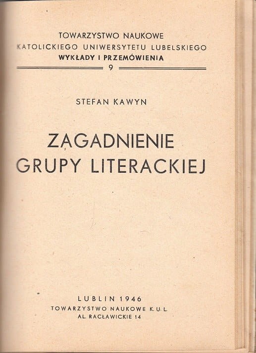 KAWYN STEFAN - ZAGADNIENIA GRUPY LITERACKIEJ. TOWARZYSTWO NAUKOWE KUL, LUBLION 1946r., str. 66, [2]; 21cm.