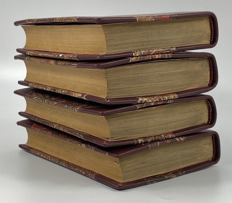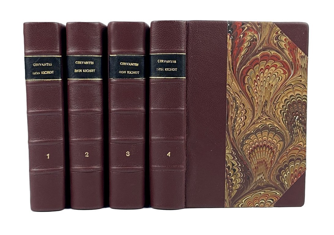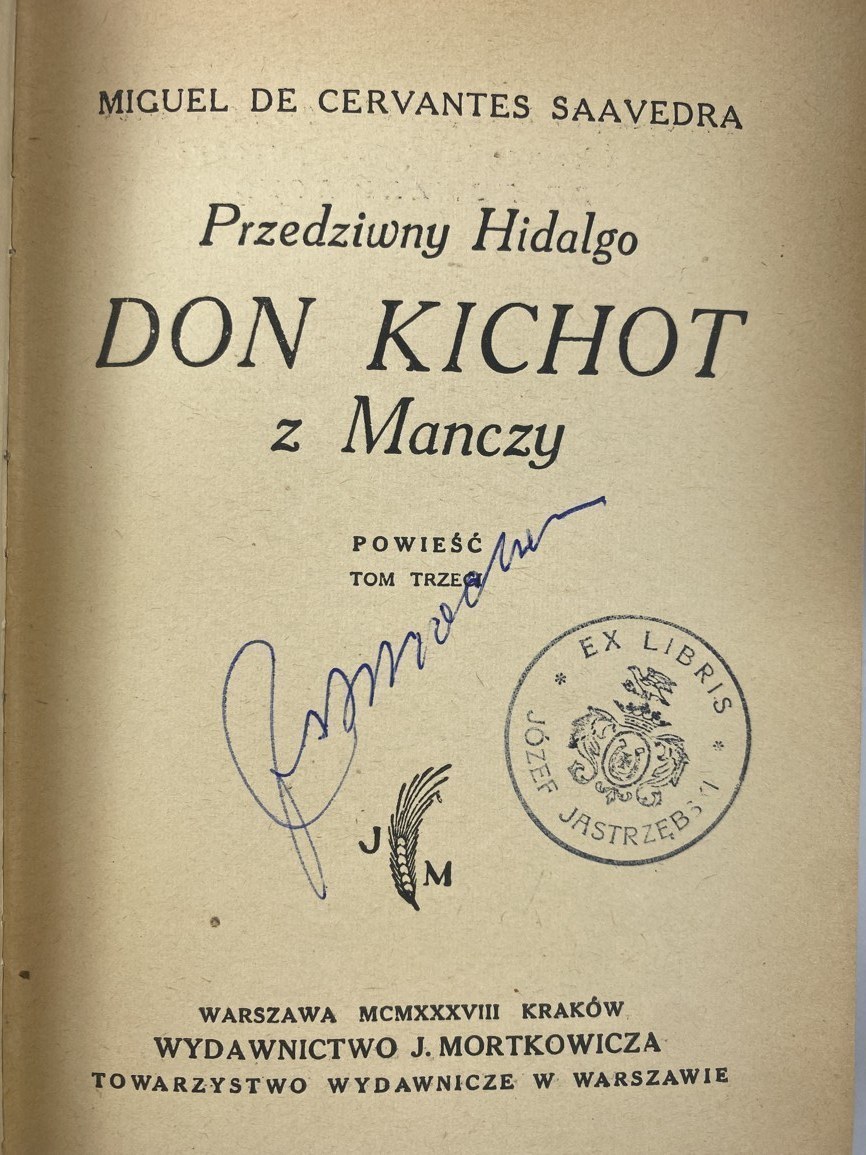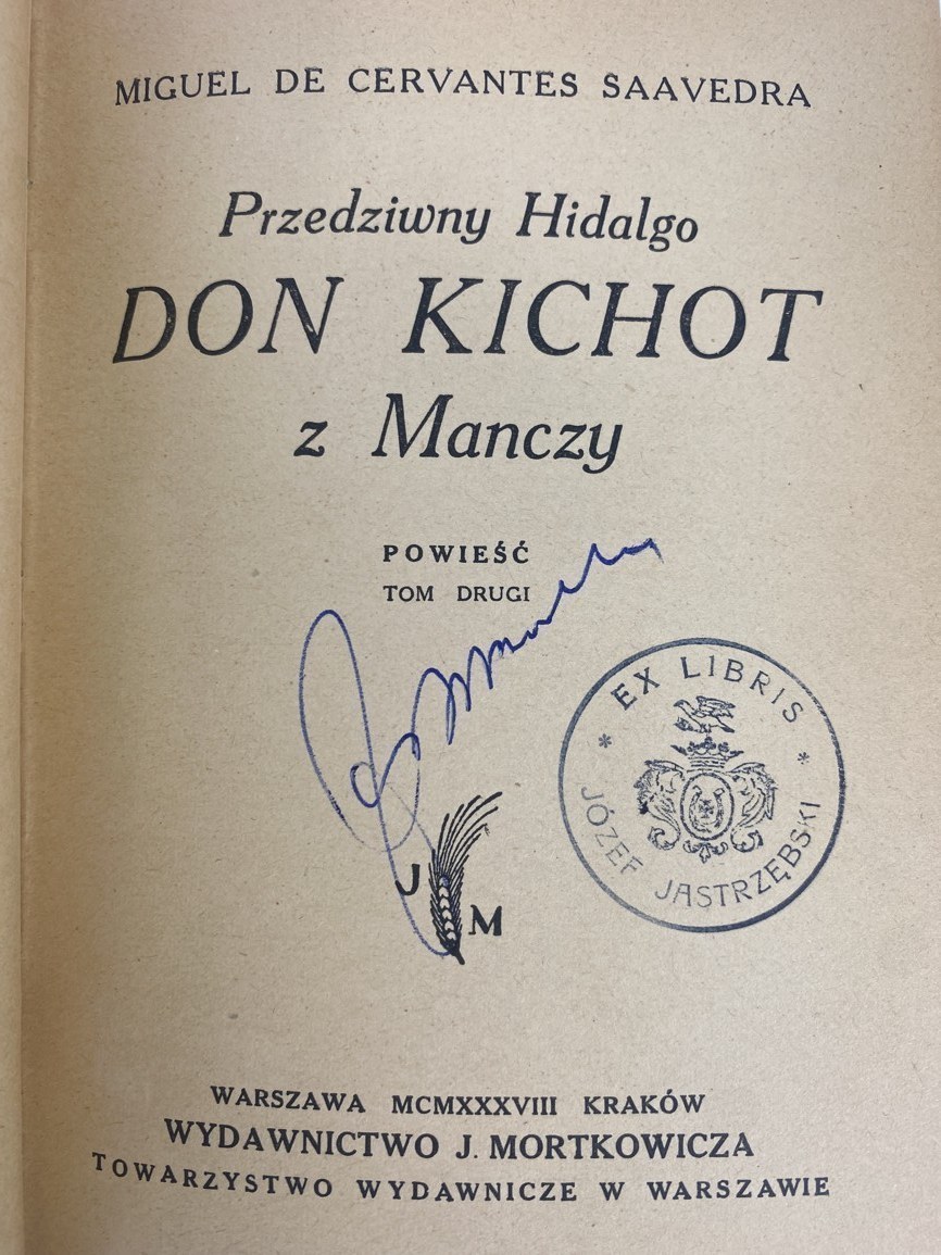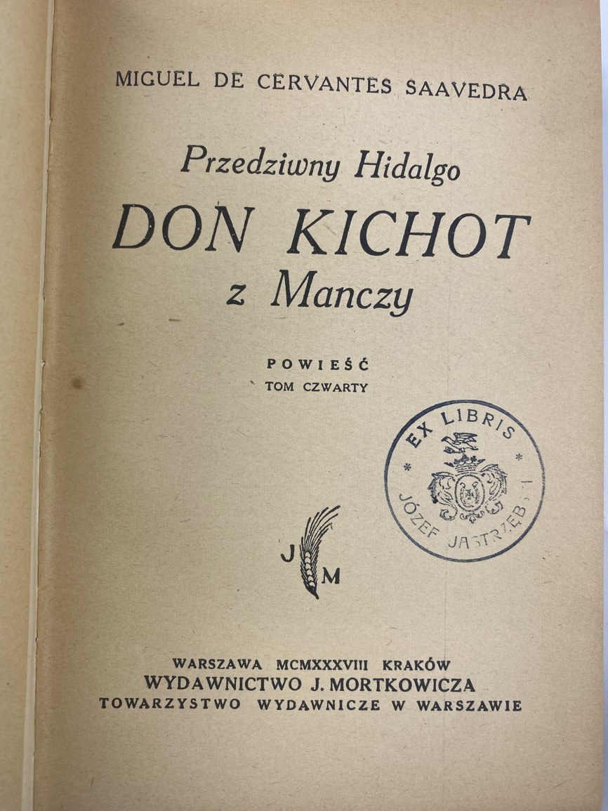 Cervantes Saavedra Miguel de, Przedziwny Hidalgo don Kichot z Manczy. Powieść. T. 1-4, Wyd. J. Mortkowicza, Warszawa-Kraków 1937-1938, s. 370, [1]; 332; 385; 370, [1], wymiary 13 x 19 cm. Przełożył z hiszpańskiego, posłowiem i komentarzem opatrzył Edward Boye. Na każdym woluminie podpis własn. i ekslibris w formie pieczątki. Półskórek wykonany ręcznie w pracowni Suszek Books.
