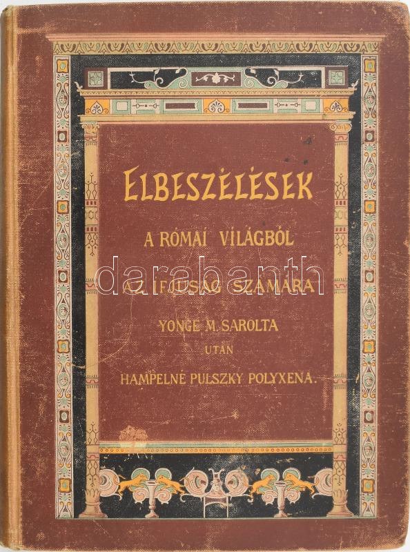 Charlotte M. Yonge: Elbeszélések a római világból. Hampelné Pulszky Polyxena fordítása. Bp, 1895, Lampel Róbert (Wodianer F. és fiai). Szövegközti fekete-fehér képtáblákkal illusztrált. Kiadói illusztrált egészvászon-kötés, kopott borítóval, egy sérült lappal, névbélyegzésekkel, és névbejegyzéssel, egy lap sérült (225/226 p.)
