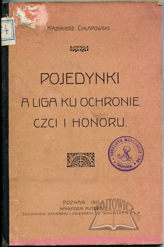 Pojedynki a liga ku ochronie czci i honoru. Poznań 1911. Nakł. autora. Czcionkami Drukarni i Księgarni św. Wojciecha. 8, s. 12, opr. ppł. wydawn.Otarcia i przybrudz. opr., pieczęć własn. i zapis numer...