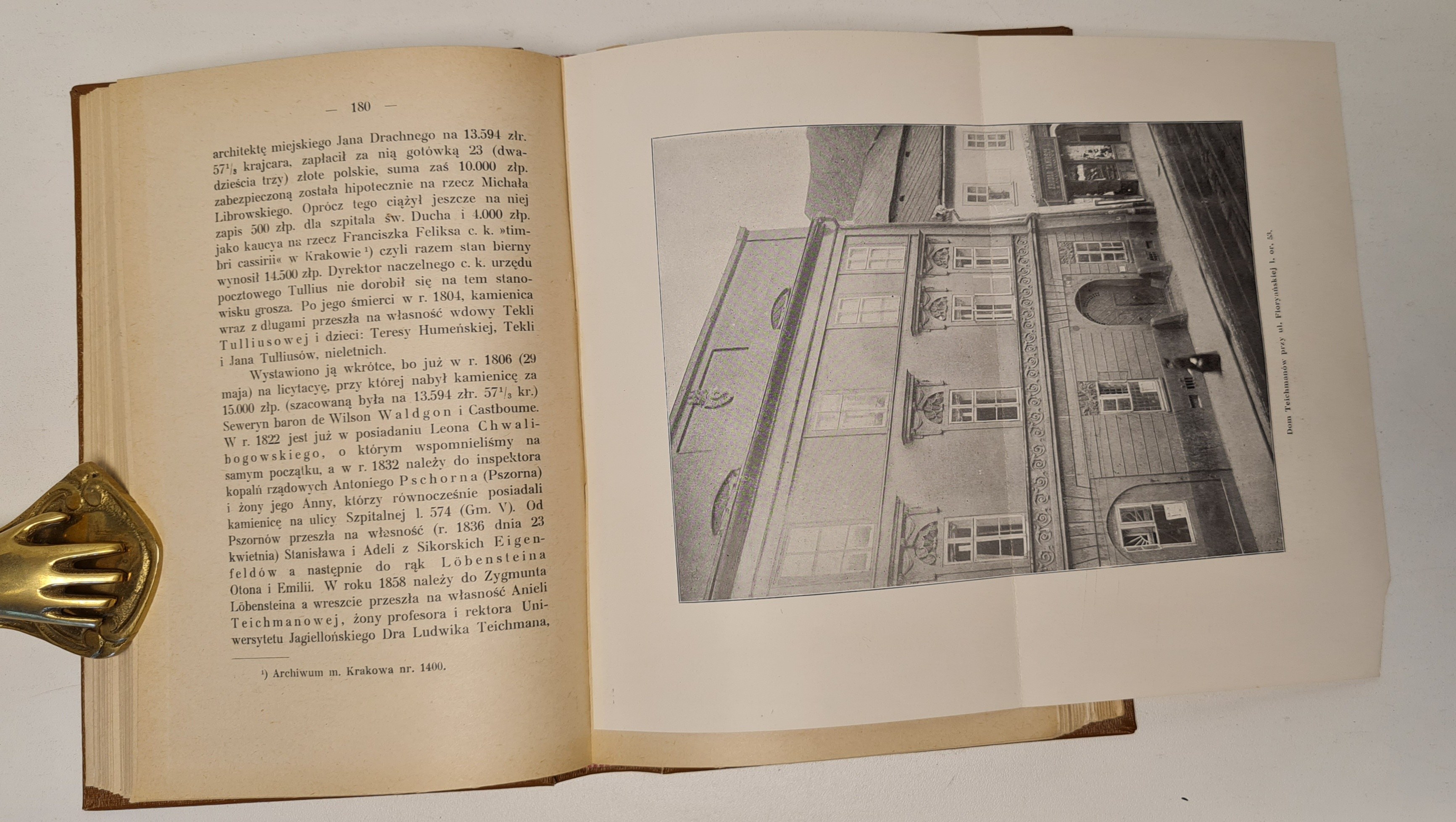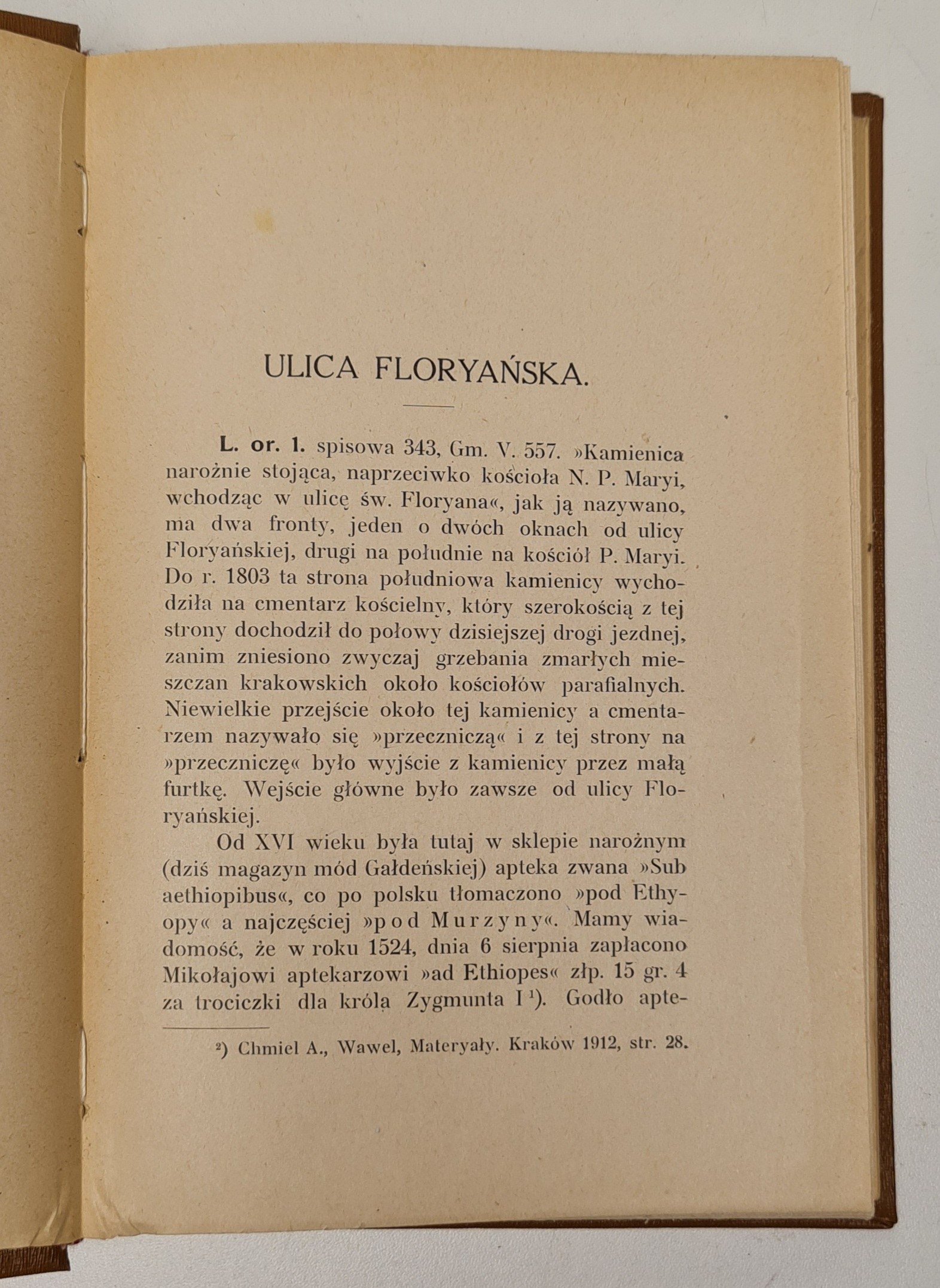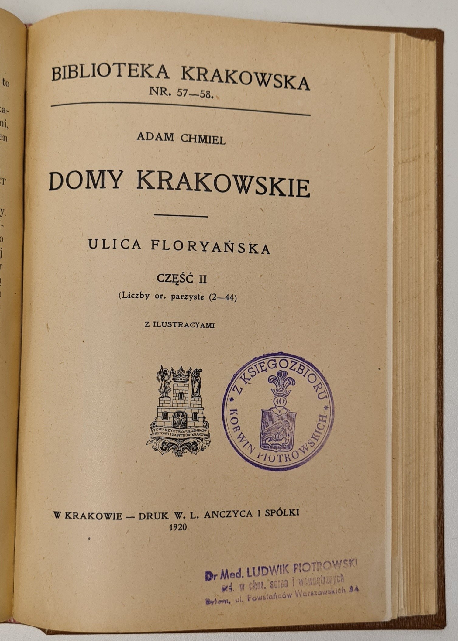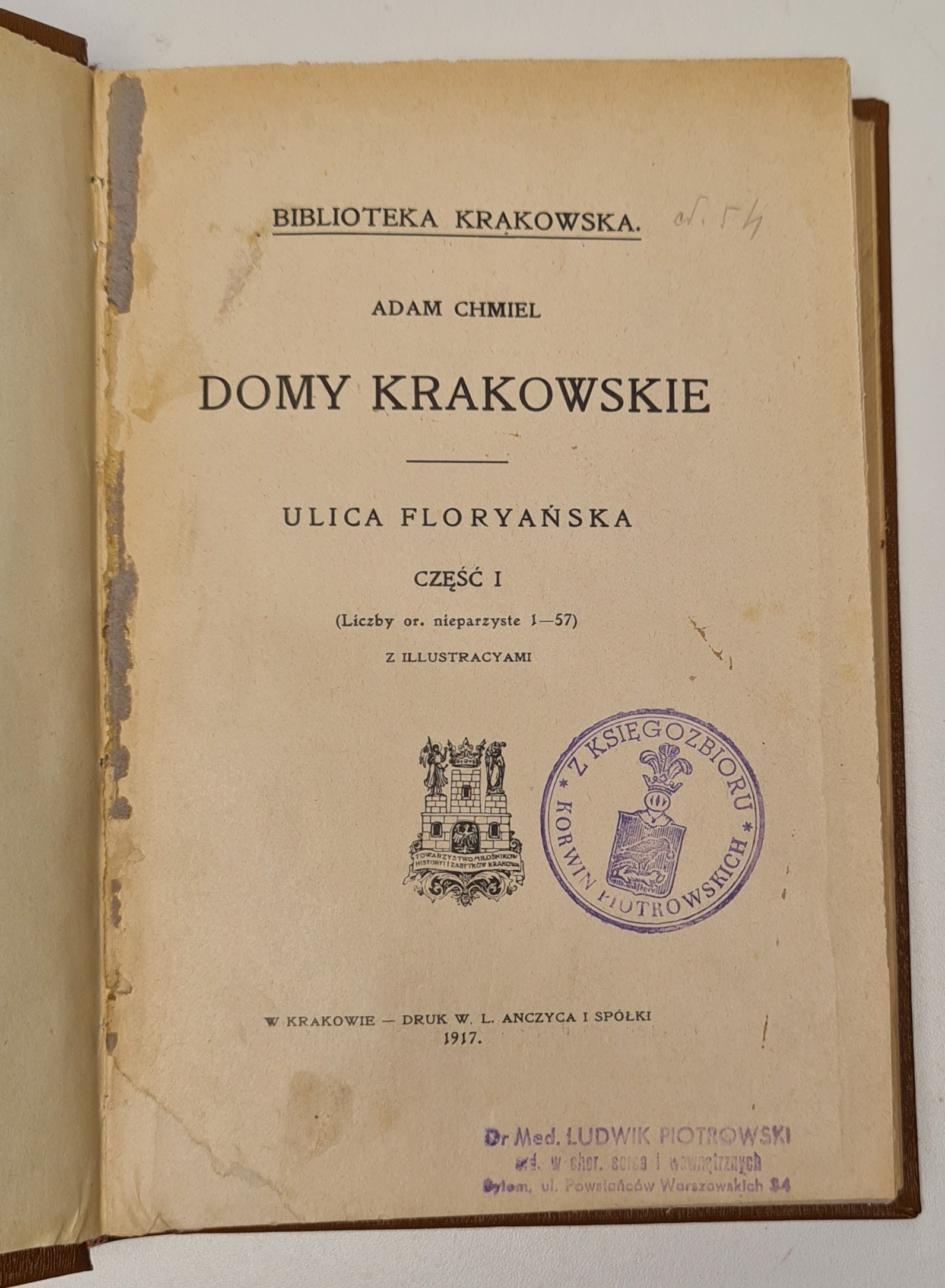 Chmiel Adam - Domy krakowskie Ulica Floryańska cz. Liczby or. nieparzyste 1- 57 z ilustracjami. Kraków 1917. Towarzystwa Miłośników Historyi i Zabytków Krakowa. W środku Sprawozdanie Towarzystwo Miłośników Historyi i Zabytków Krakowa za rok 19191. druk W.L. Anczyca, Biblioteka. Wym14x21,5cm. s.198, Opr. Introligatorska płócienna, Pieczęć własnościowa Korwin Piotrowskich. Stan zachowania dobry +