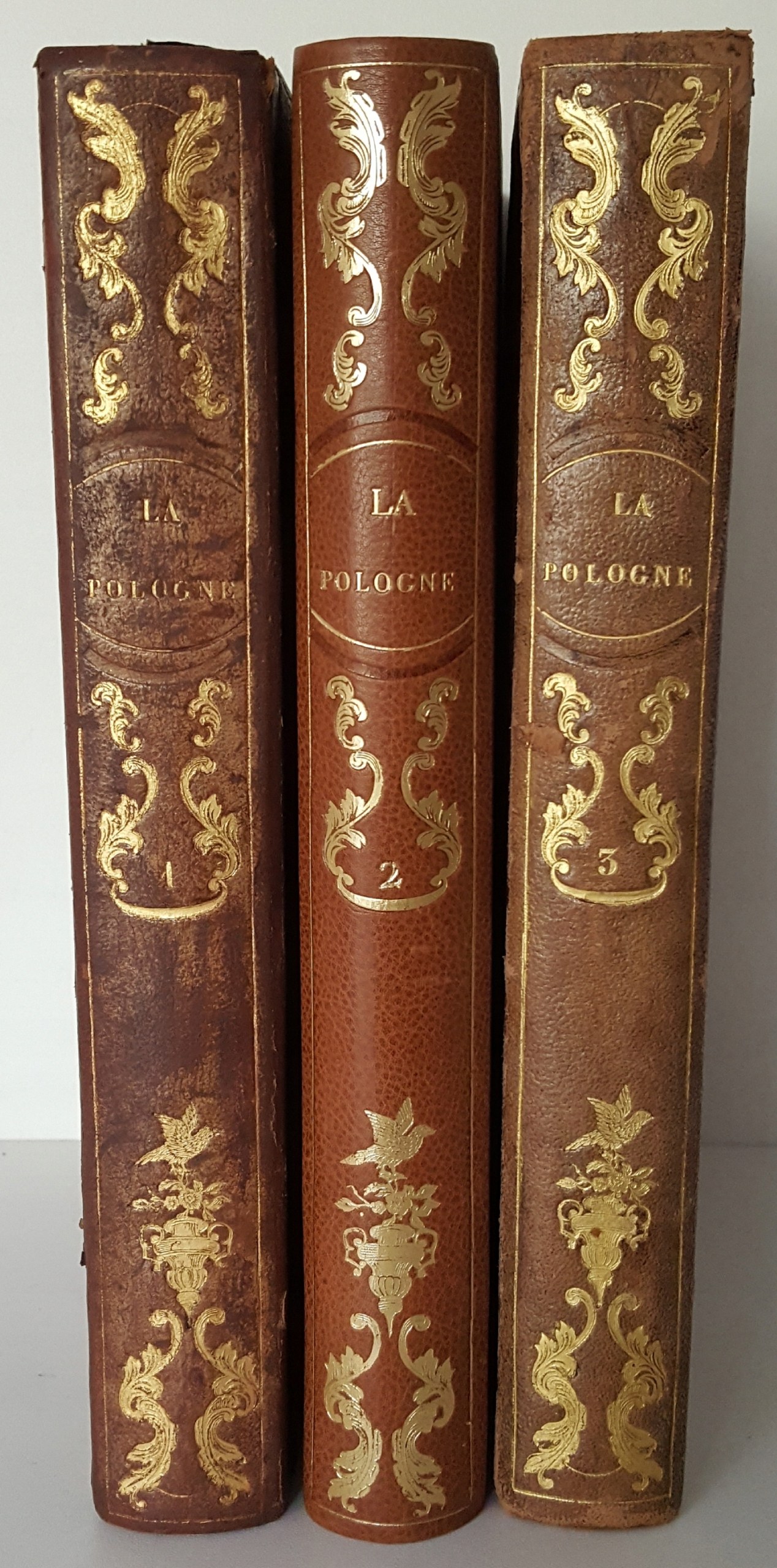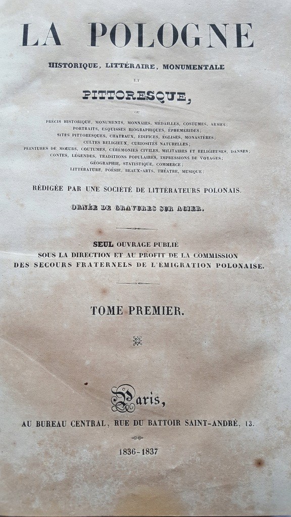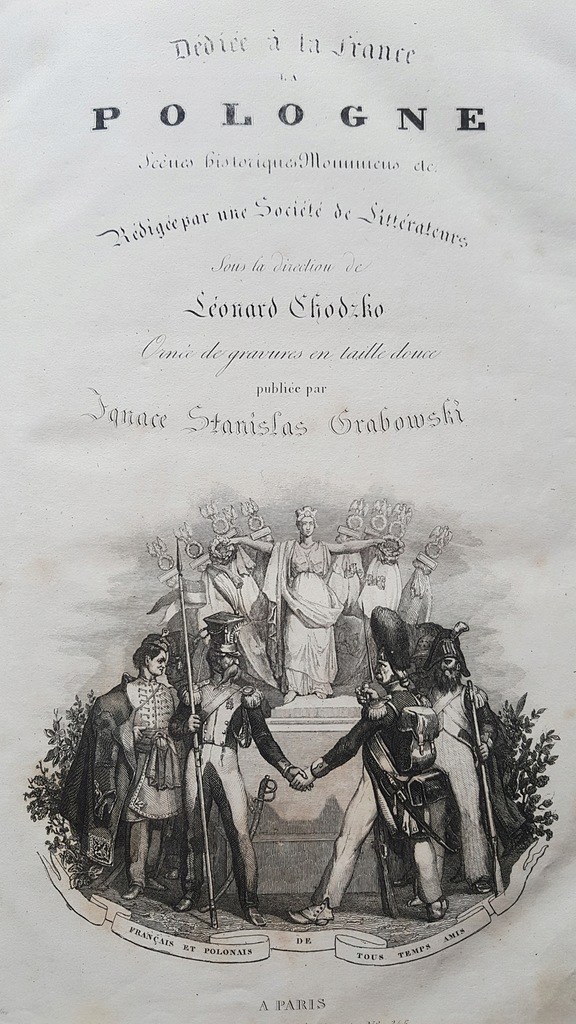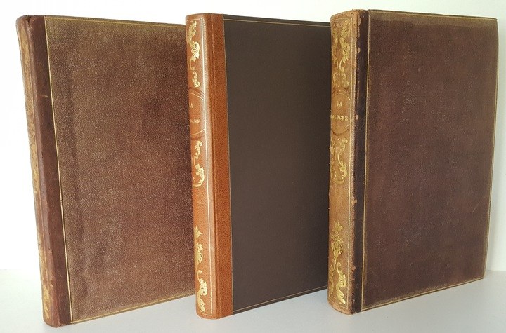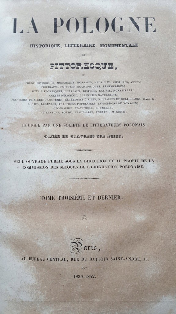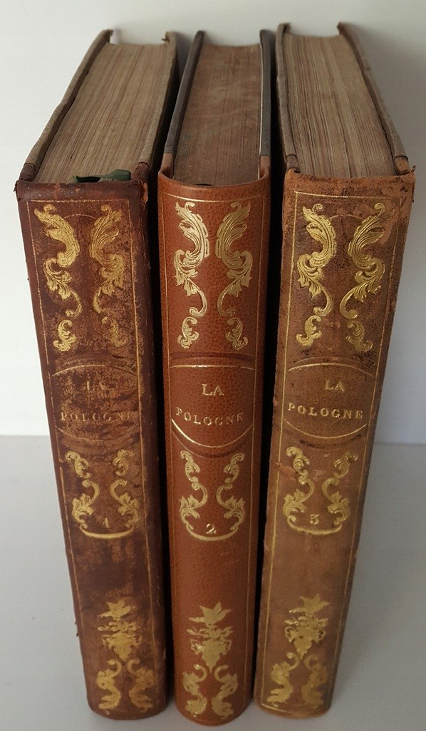 Opracowanie Polskiego Towarzystwa Literackiego. Ozdobione stalorytami. Wydane Au Bureau Central, Paryż 1836-1842.Wym. 28,5x19,4 cm ; stron 480+480+480. Oprawa oryginalna z epoki w tomach I i III, w tomie II oprawa współcześnie dorabiana na wzór oryginalnej, półskórek z pięknie zdobionym grzbietem(znaczne przetarcia grzbietu w tomie III, otarcia grzbietu w tomie I). Marmoryzowane obcięcia kart w tomie II.