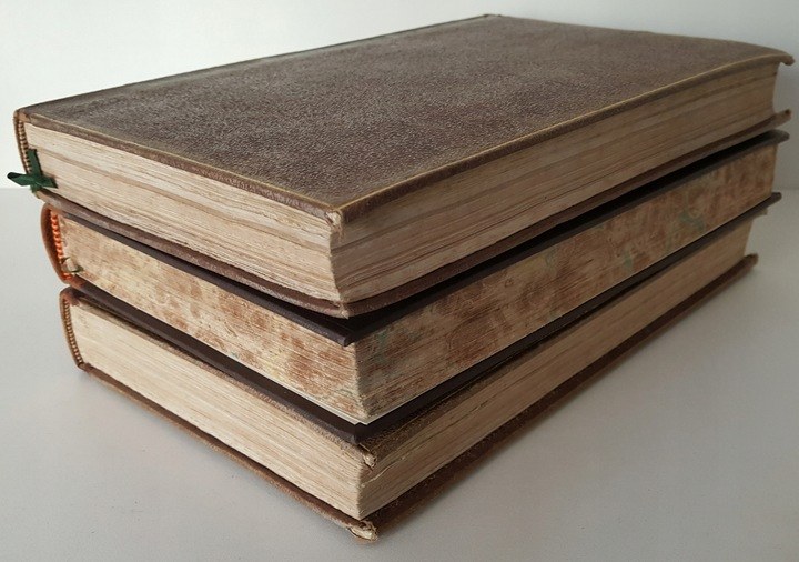 Znaczny foxing-odbarwienia papieru, charakterystyczne dla książek z tego okresu, zabrudzenia kart. Podpis własnościowy na stronie tytułowej tomu II. Zabrudzenia obcięć kart we wszystkich tomach.