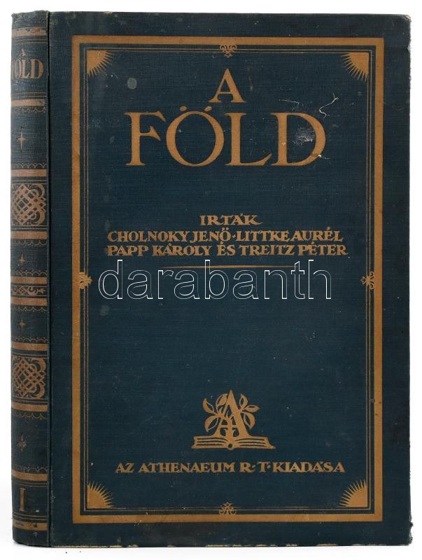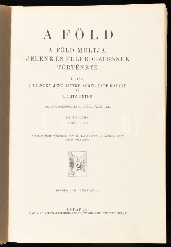 Cholnoky Jenő - Littke Aurél - Papp Károly - Treitz Péter: A Föld. A Föld múltja, jelene és felfedezésének története. I. rész. Bp., [1926], Athenaeum. Szövegközi és egészoldalas képekkel gazdagon illusztrálva. Kiadói aranyozott egészvászon-kötés, kissé sérült, foltos borítóval, helyenként kissé foltos lapokkal, ex libris-szel.